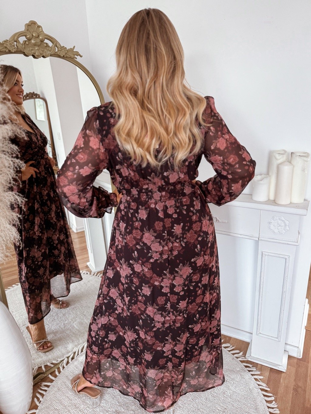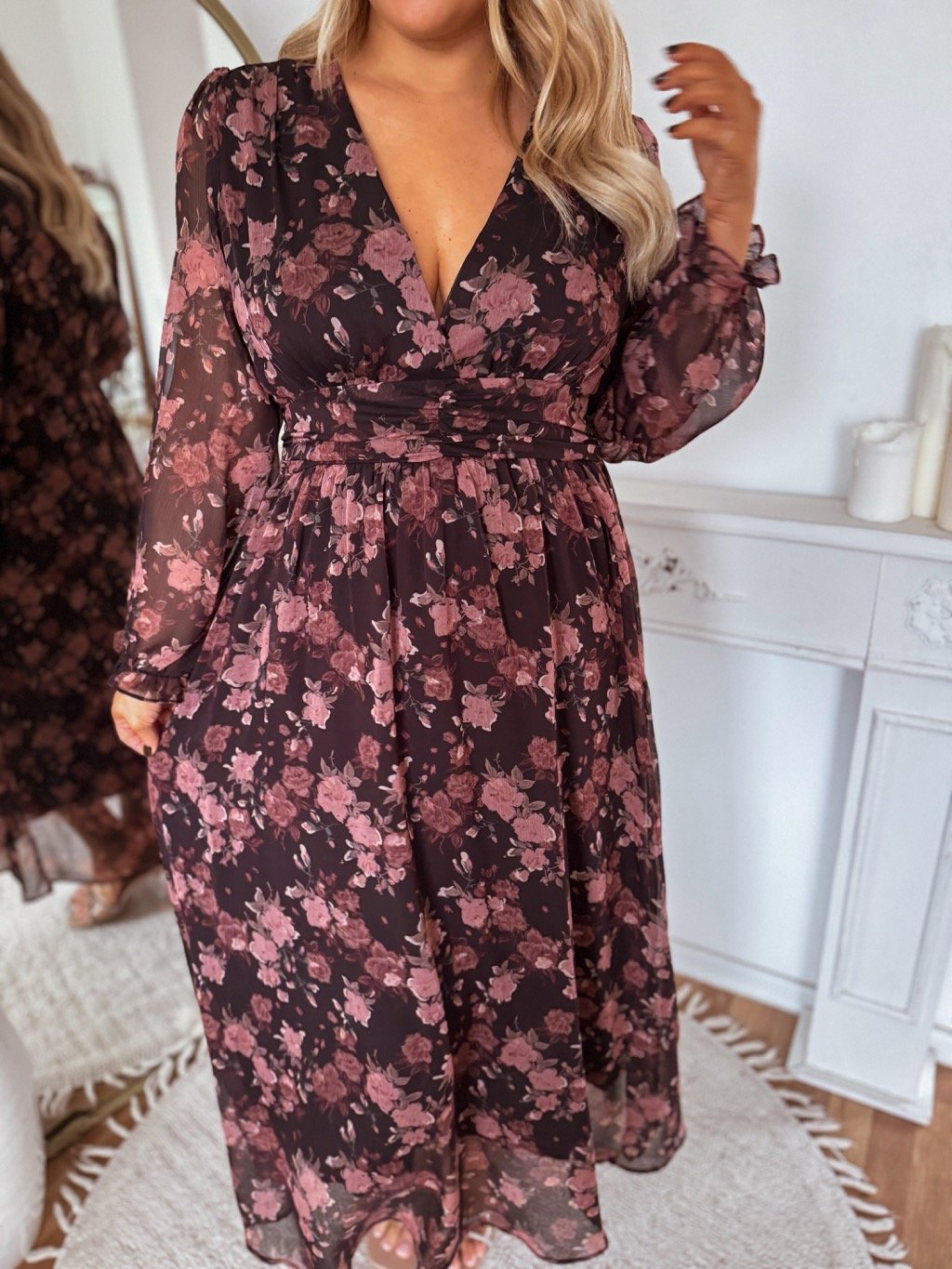 Dlhé slávnostné šaty pre moletky s dlhým rukávom a výstrihom, šaty majú gumičku v páse ktorá krásne formuje siluetu. Modelka meria 168 cm a má na sebe veľkosť XL.