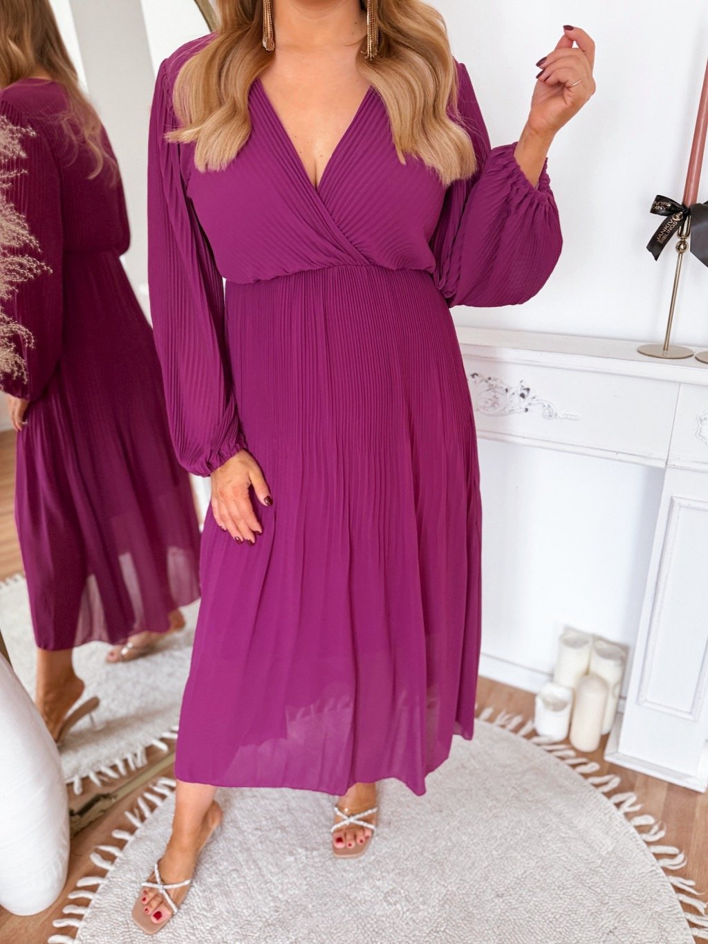 Elegantné plisované šaty s dlhými rukávmi majú voľnejší strih a elastickú gumičku v páse. Trblietavý opasok nie je súčasťou šiat, nájdete ho medzi doplnkami. Šaty sú v oblasti bokov úplne voľné. Modelka meria 168 cm a má na sebe veľkosť L/XL.