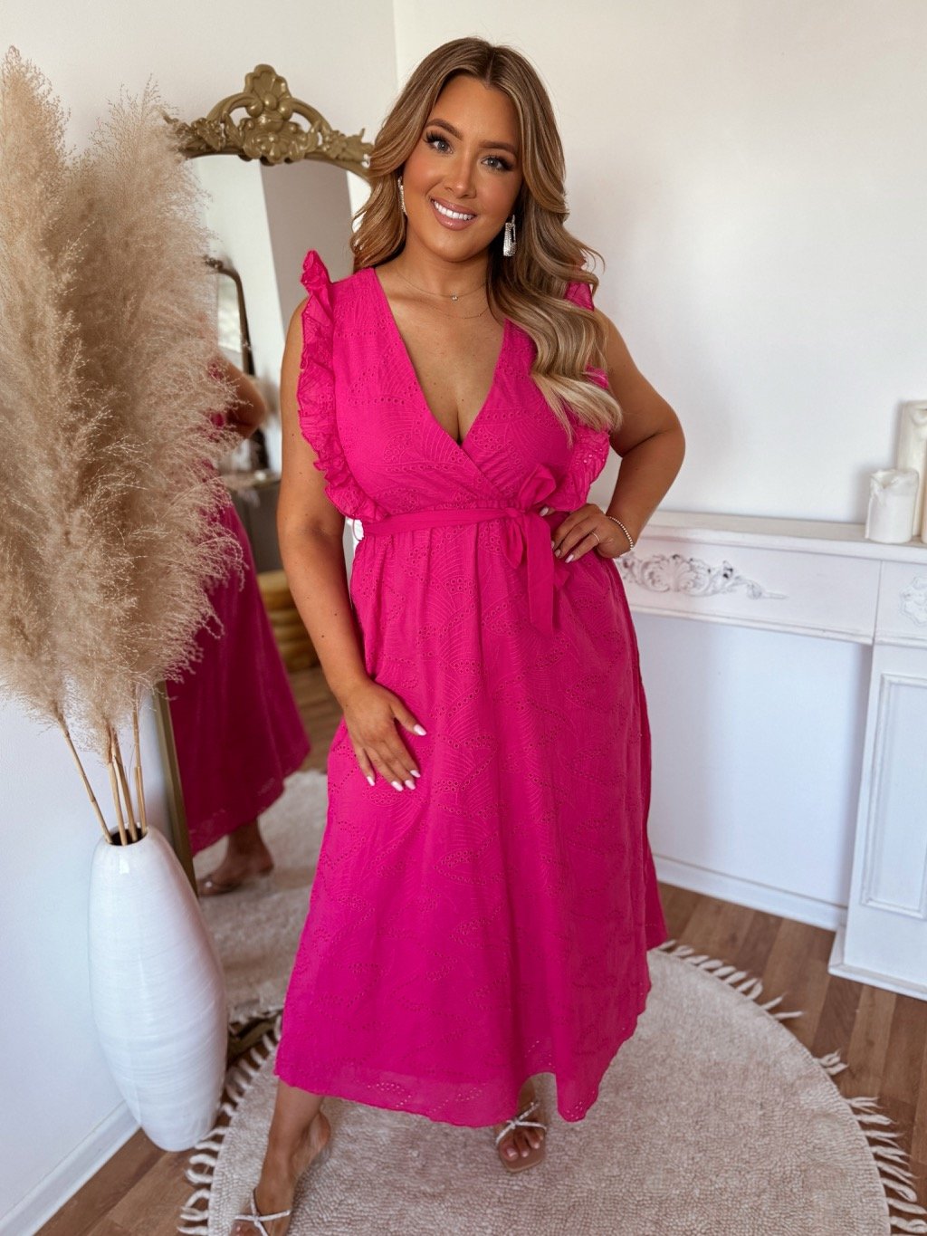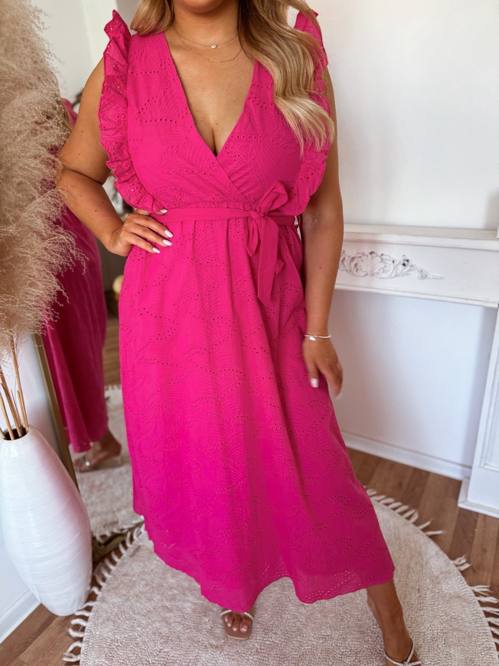 Dlhé fuchsiové bavlnené dámske šaty s madeira čipkou, výstrihom do V a krátkym volánovým rukávom. Šaty majú gumičku v páse a opasok. Modelka meria 168 cm a má na sebe veľkosť L/XL.