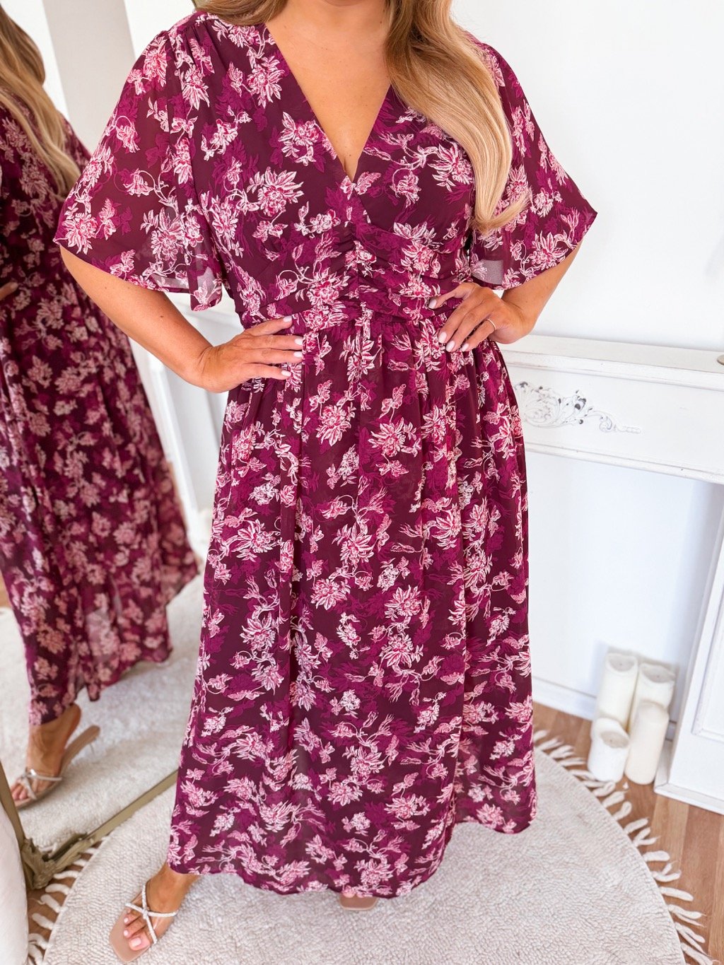 Dlhé fuchsiové dámske šaty plus size s krátkym rukávom a rozparkom. Šaty majú elastickú gumu v páse. Modelka meria 168 cm a má na sebe veľkosť XL.