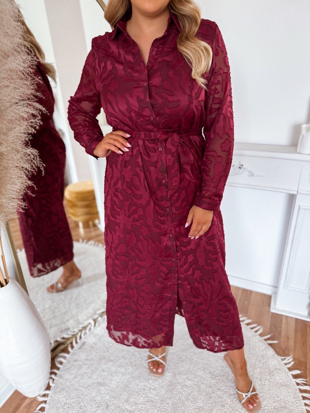 Dlhé dámske košeľové šaty majú voľnejší strih a sťahujú sa opaskom v páse. Rukávy sú priehľadné. Modelka meria 168 cm a má na sebe veľkosť L/XL.