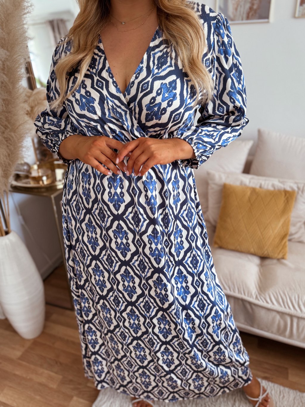 Dlhé saténové šaty majú voľnejší strih a gumičku pod prsiami. Modelka meria 168 cm a má na sebe veľkosť XL.