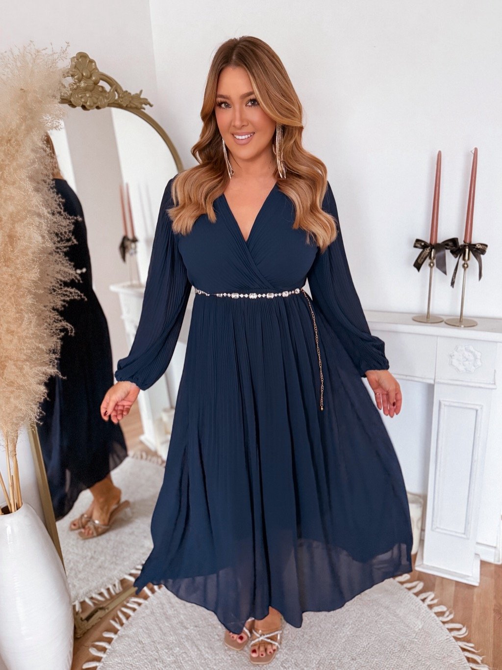 Elegantné plisované šaty s dlhými rukávmi majú voľnejší strih a elastickú gumičku v páse. Trblietavý opasok nie je súčasťou šiat, nájdete ho medzi doplnkami. Šaty sú v oblasti bokov úplne voľné. Modelka meria 168 cm a má na sebe veľkosť L/XL.