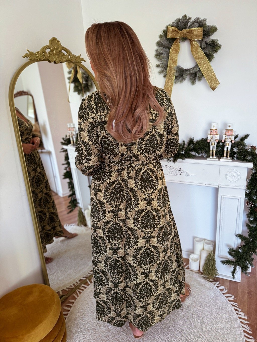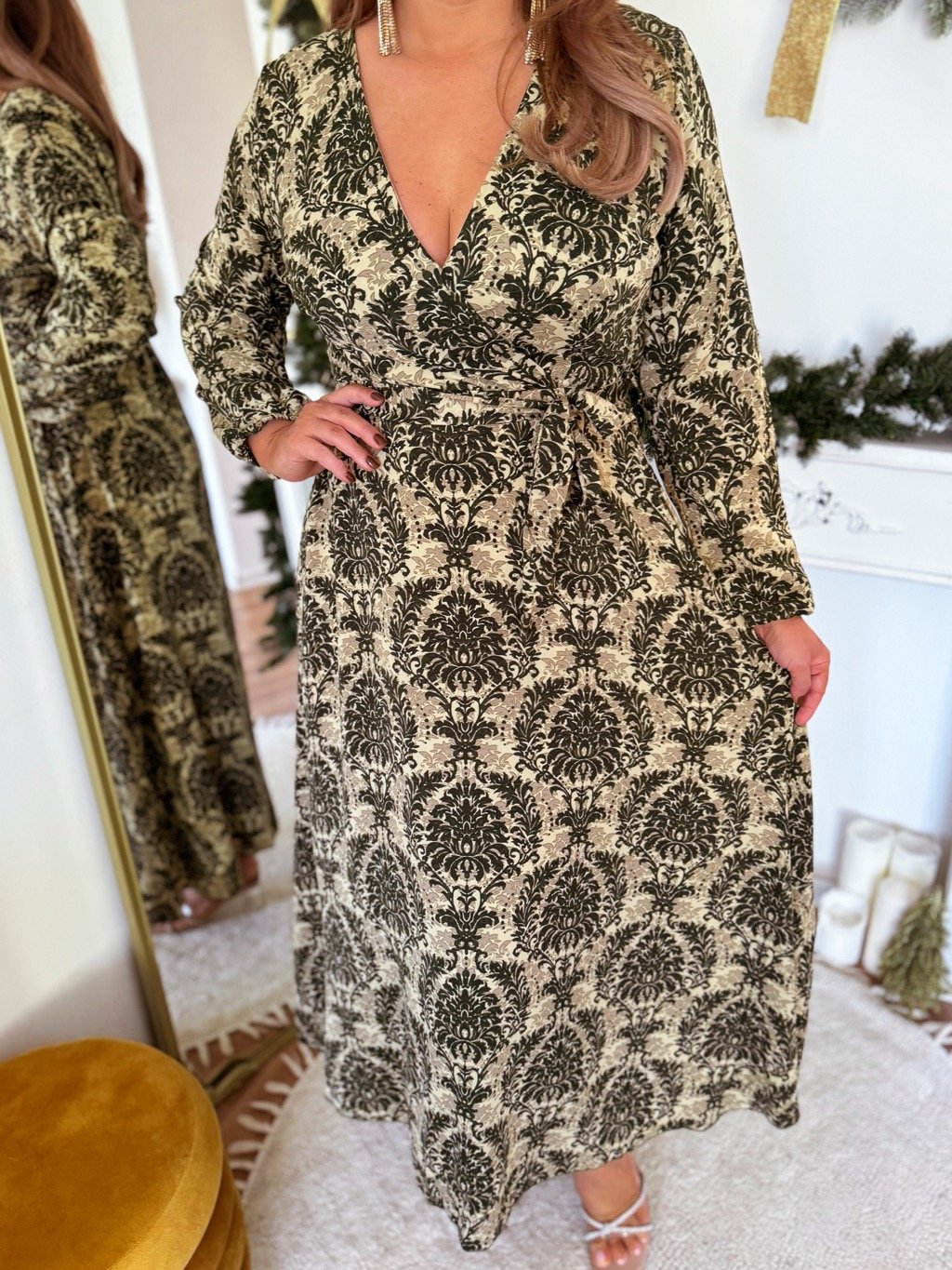Elegantné vzorované šaty s dlhým rukávom a výstrihom do V. Pod prsiami je elastická gumička. Modelka meria 168 cm a má na sebe veľkosť L/XL.