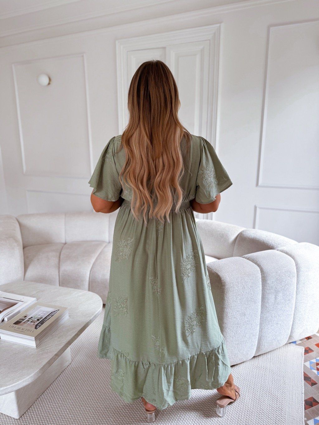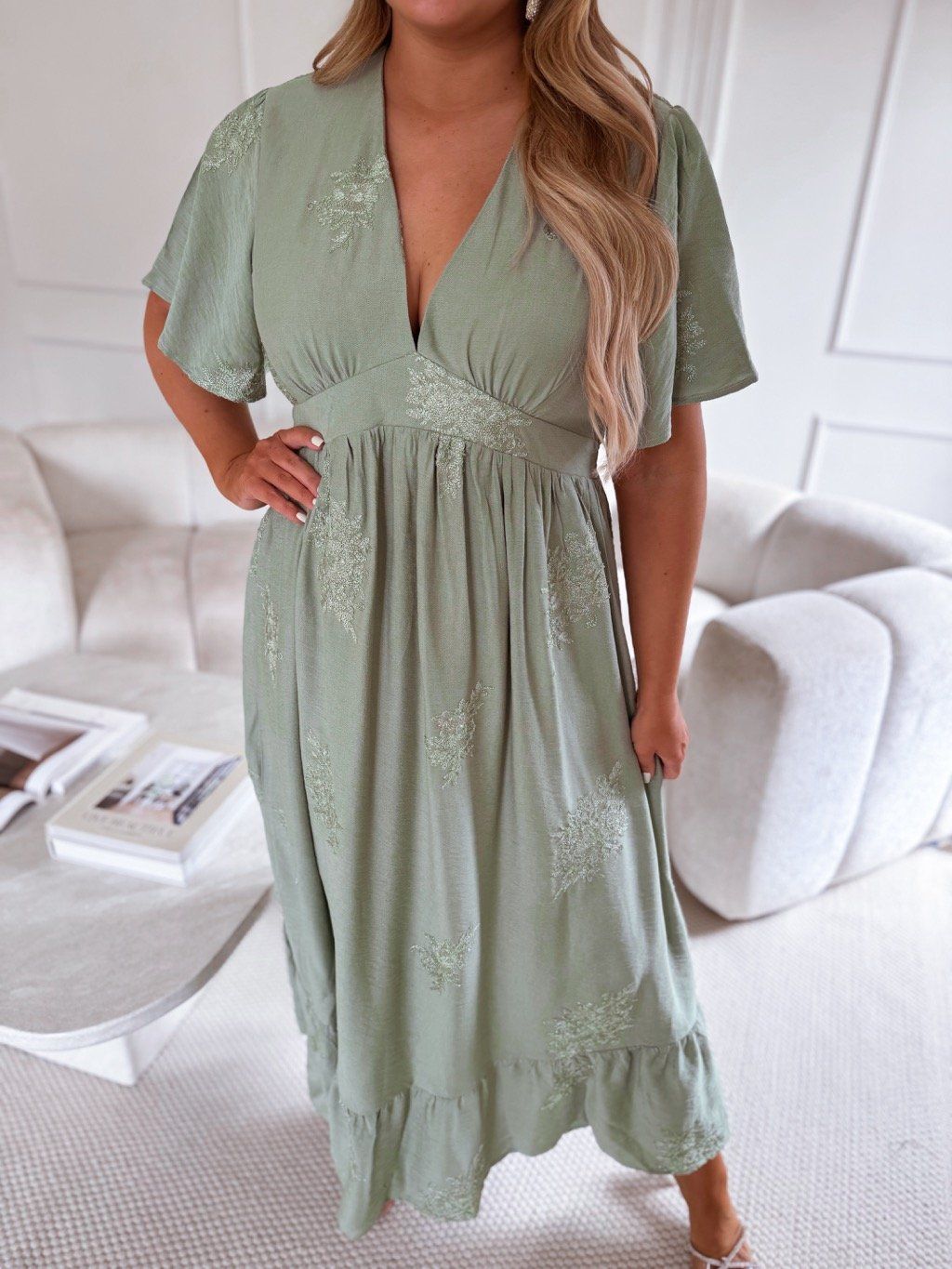 Dlhé viskózové zelené šaty s výšivkou. Šaty majú voľnejší strih a elastickú gumičku v páse na zadnej strane. Sukňa na šatách je úplne voľná. Modelka meria 168 cm a má na sebe veľkosť XL.