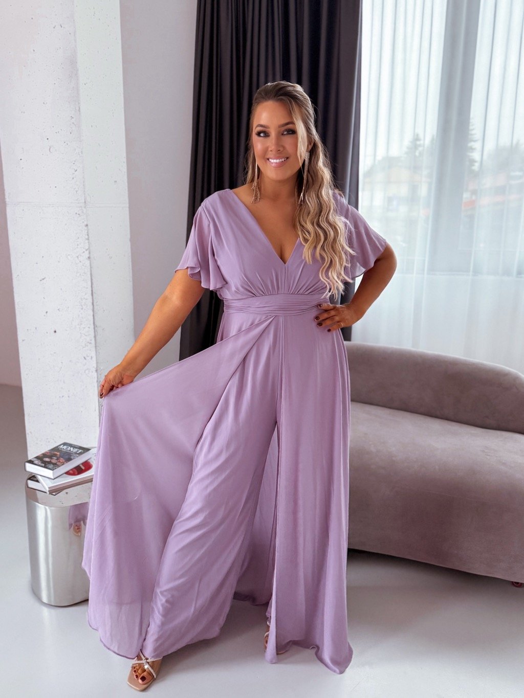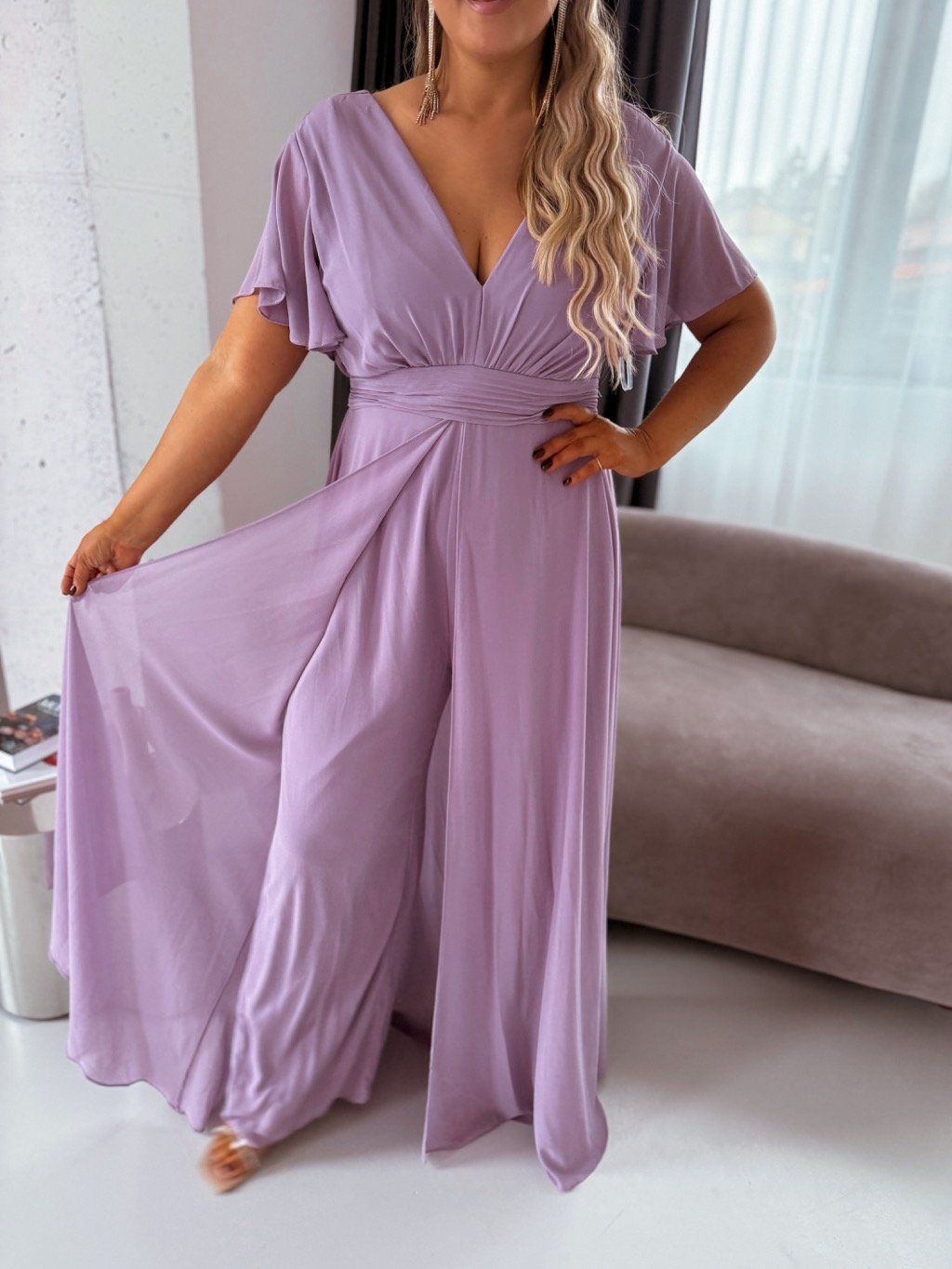 Tento elegantný overal má zips na chrbte a gumičku v páse. Zo zadnej strany vyzerá ako klasické šaty, sukňa krásne vlaje pri chôdzi. Modelka meria 168 cm a má na sebe veľkosť XL (42).