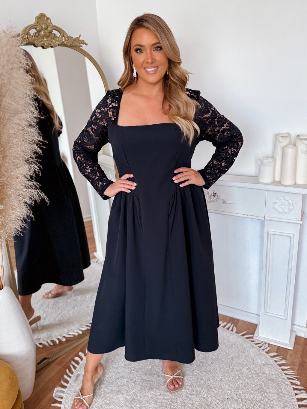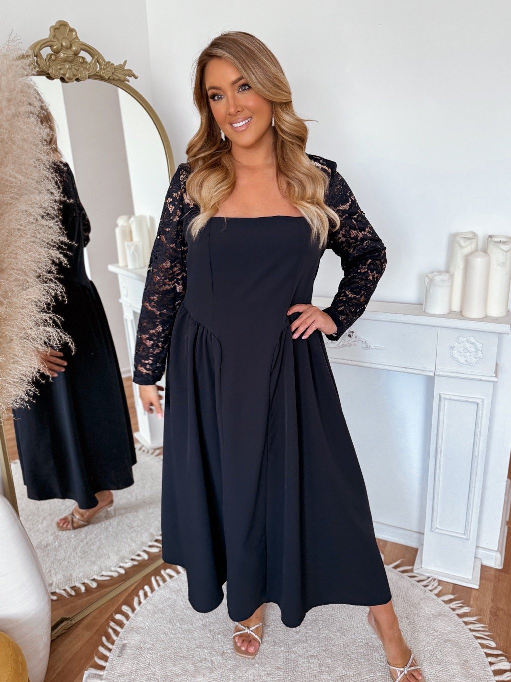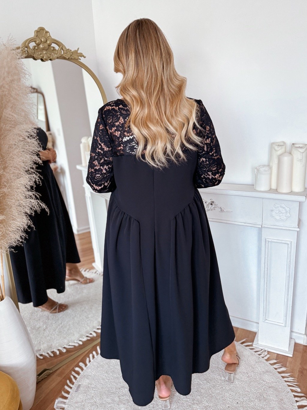 Elegantné áčkové šaty s bohatou sukňou a čipkou na rukávoch. Šaty majú jemne vypchávky na prsiach, majú voľný strih. Šaty sedia na veľkosti 2XL- 4XL. Modelka meria 168 cm a má na sebe univerzálnu veľkosť.