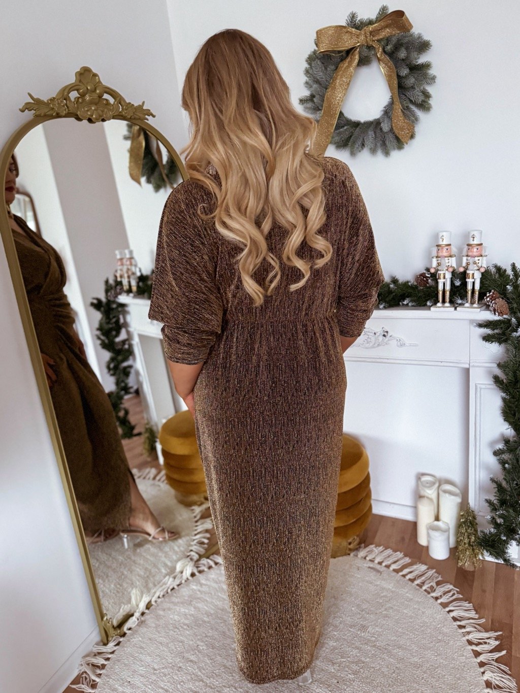 Elegantné dámske šaty v zlatej sú vyrobené z jemne lesklého veľmi elastického materiálu. Šaty majú výstrih do V, dlhé rukávy, riasenie na boku a asymetrický lem s rozparkom, ktorý zvýrazňuje postavu. Ideálne na slávnostné príležitosti či vianočné večierky.. Modelka meria 168 cm a má na sebe veľkosť XL/XXL.