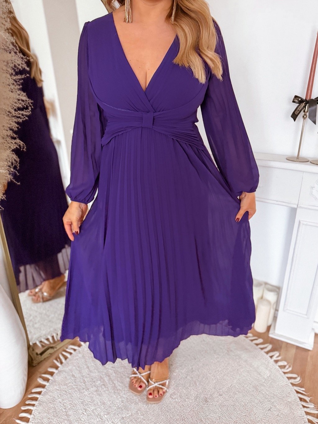 Elegantné plisované šaty s dlhými rukávmi majú užší strih na prsiach a elastickú gumičku v páse. Šaty sú v oblasti bokov úplne voľné. Modelka meria 168 cm a má na sebe veľkosť L/XL.