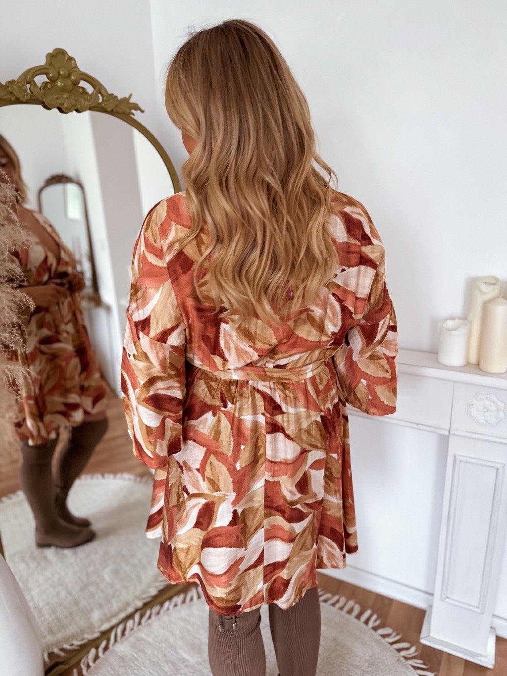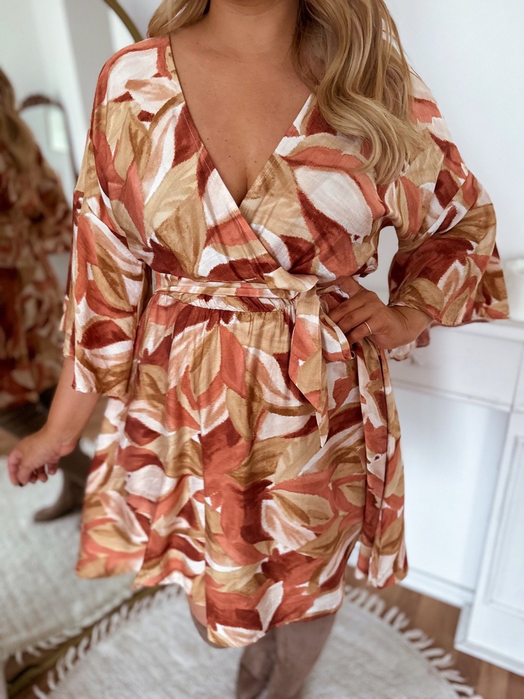 Krátke bavlneno-ľanové šaty gumičkou v páse a širokým rukávom, šaty sú elastické. Modelka meria 168 cm a má na sebe veľkosť L/XL.