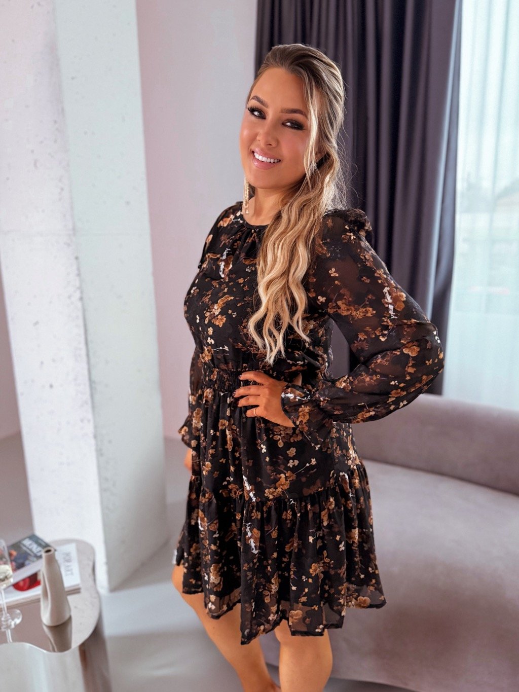 Krátke čierne šaty s hnedými kvetmi