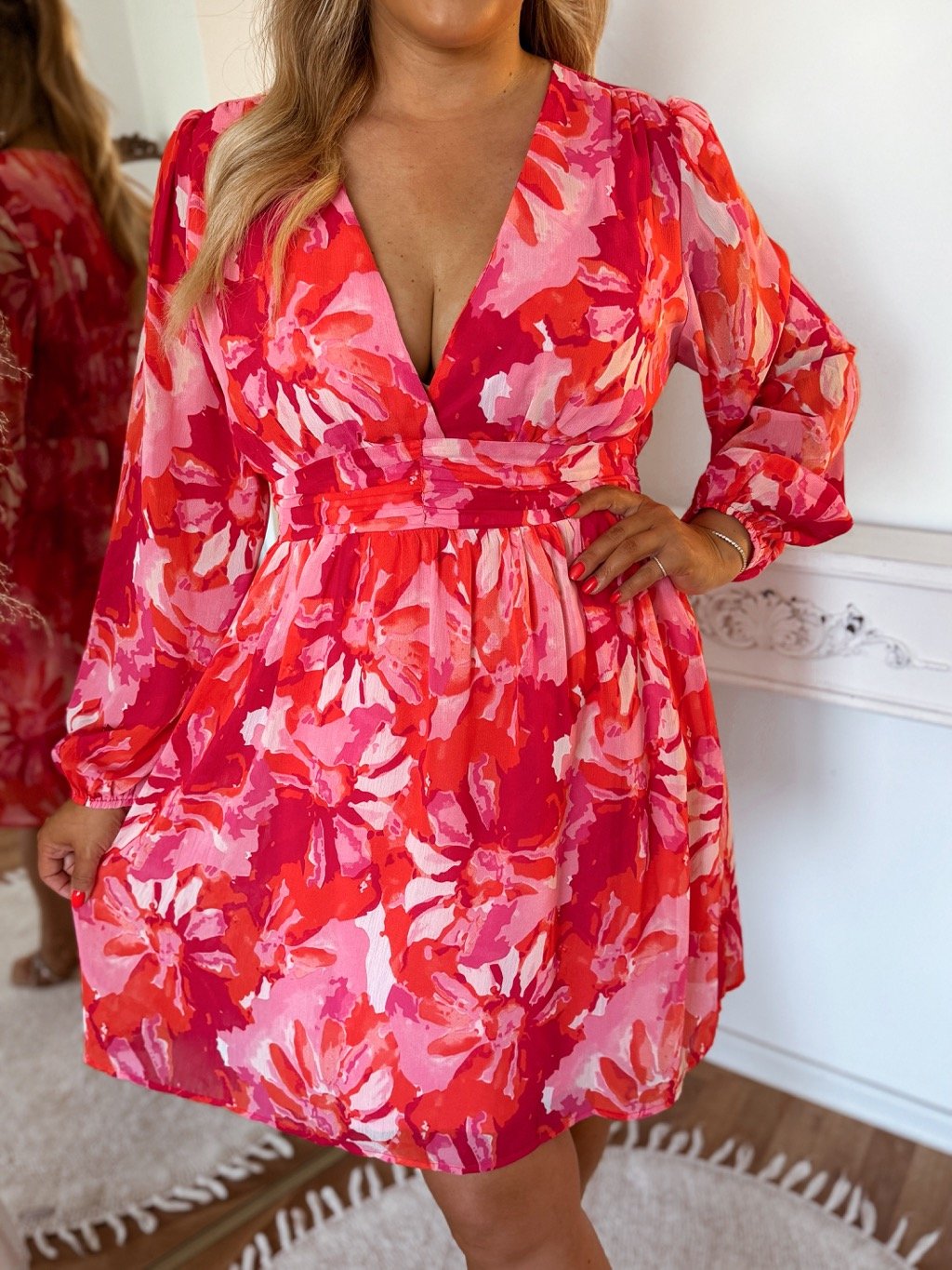Krátke farebné šaty pre moletky so vzorom kvetov majú gumičku v páse, boky majú voľný strih. Modelka meria 168 cm a má na sebe veľkosť XL.