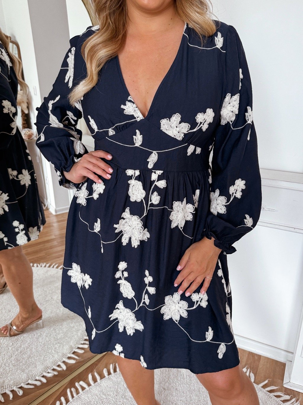 Krátke tmavomodré šaty s vyšívanými kvetmi