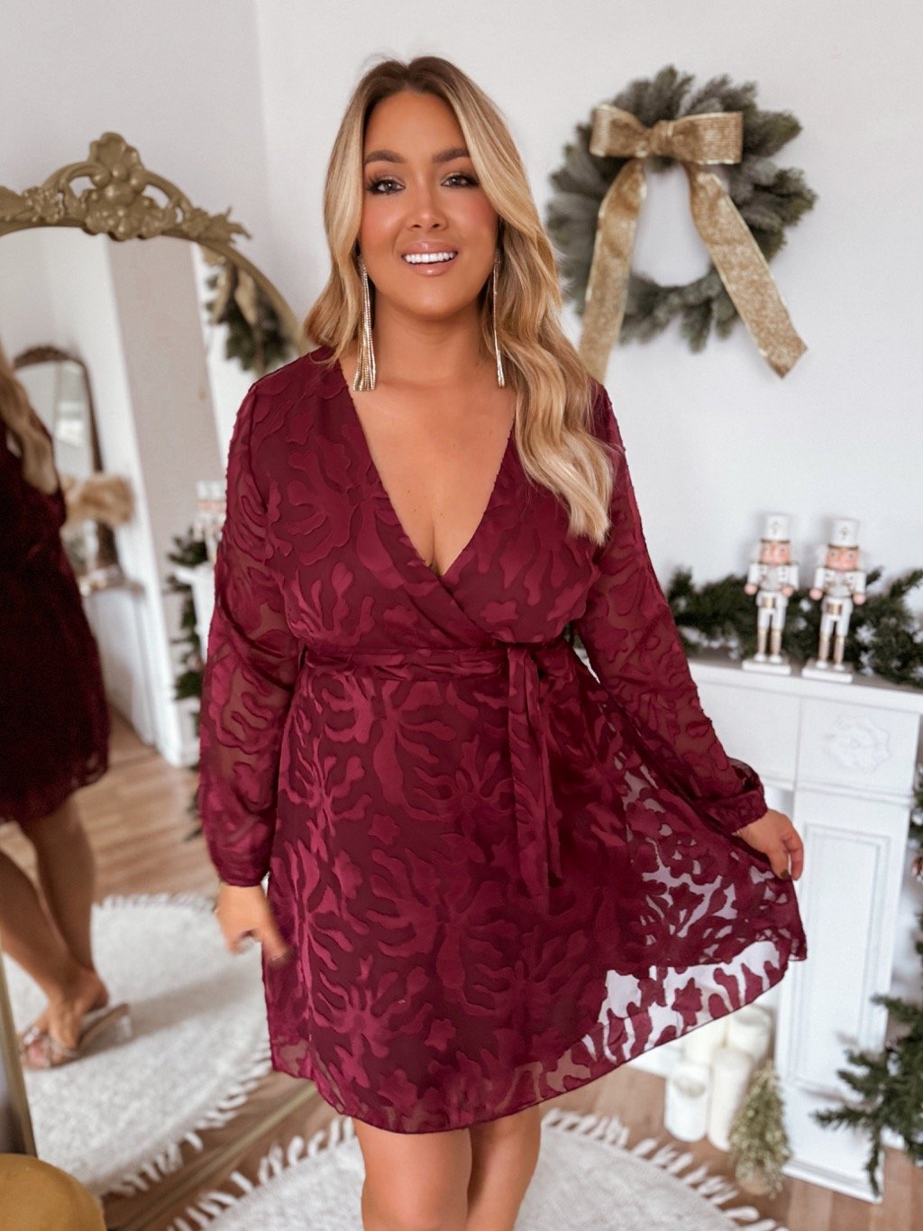 Krátke šaty s dlhým rukávom, elastickou gumičkou v páse a opaskom. Modelka meria 168 cm a má na sebe veľkosť L/XL.