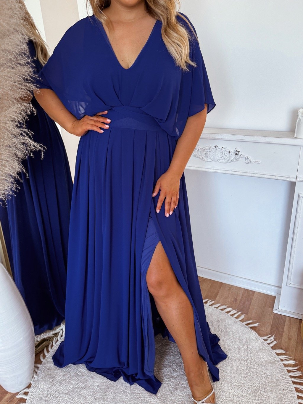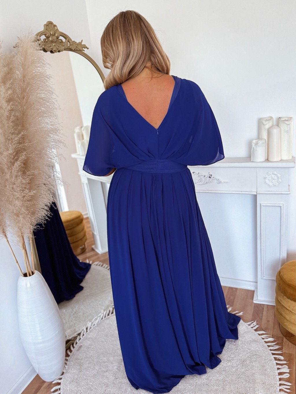 Spoločenské šaty pre moletky s krátkym rukávom, šaty majú úplne voľný strih a sú zúžené v páse. Šaty majú zips na chrbte. Modelka meria 168 cm a má na sebe veľkosť XXL.