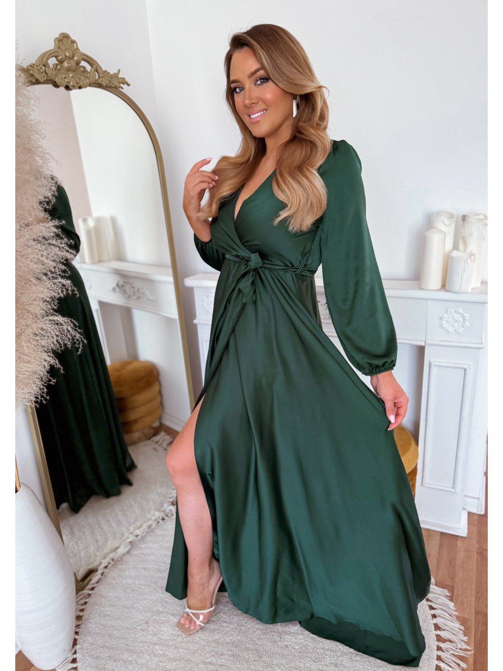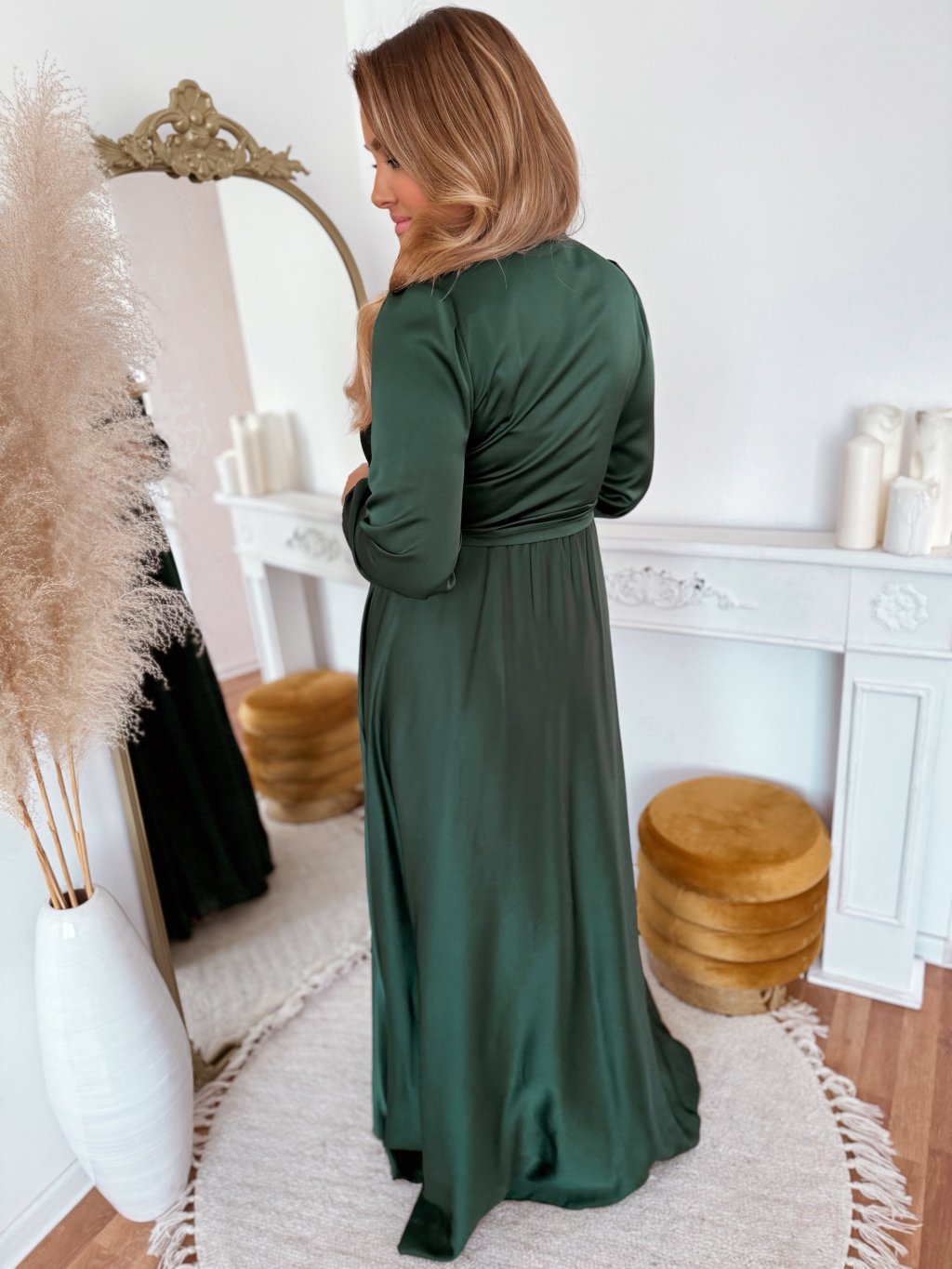 Saténové šaty s gumičkou v páse a látkovým opaskom. Šaty majú úplne voľnú sukňu. Modelka meria 168 cm a má na sebe veľkosť L/XL.