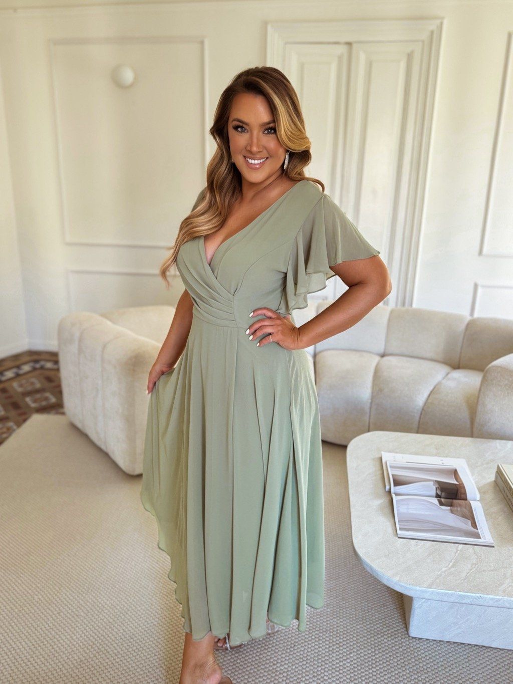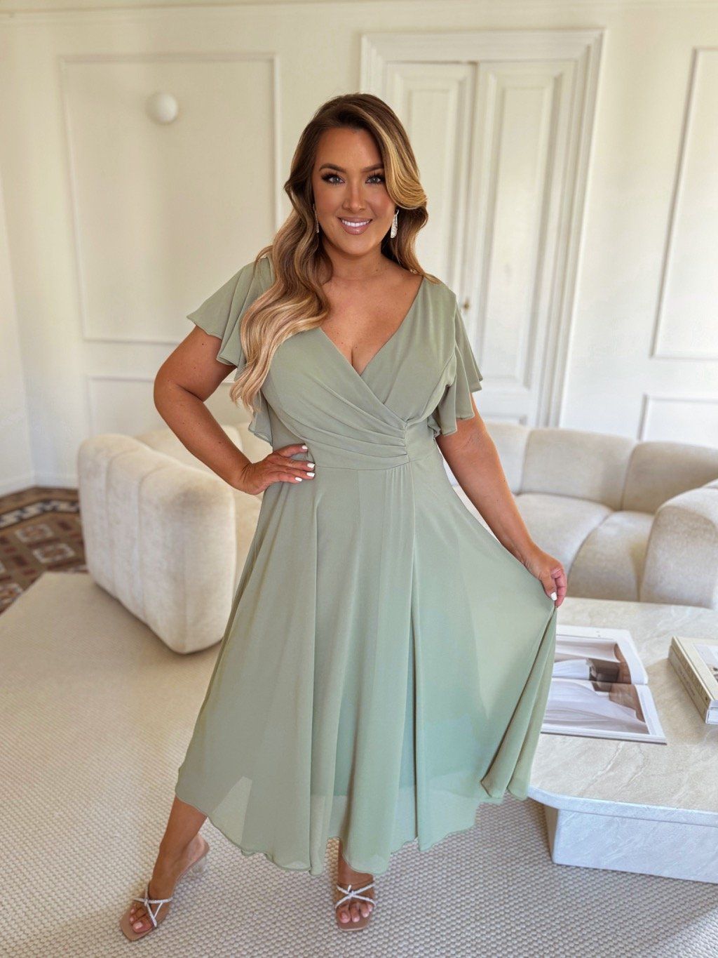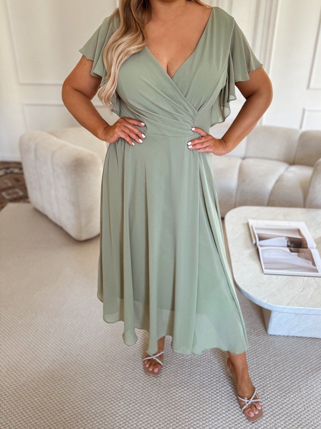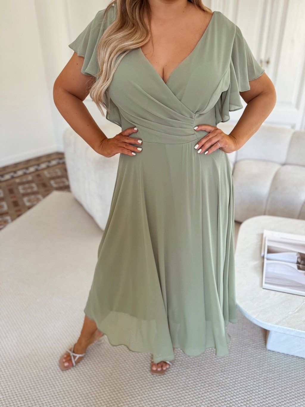 Elegantné spoločenské šaty pre moletky v bledozelenej sú vyrobené z mierne elastického materiálu, majú zips na chrbte a jemnú výstuž na prsiach. Modelka meria 168 cm a má na sebe veľkosť 2XL.
