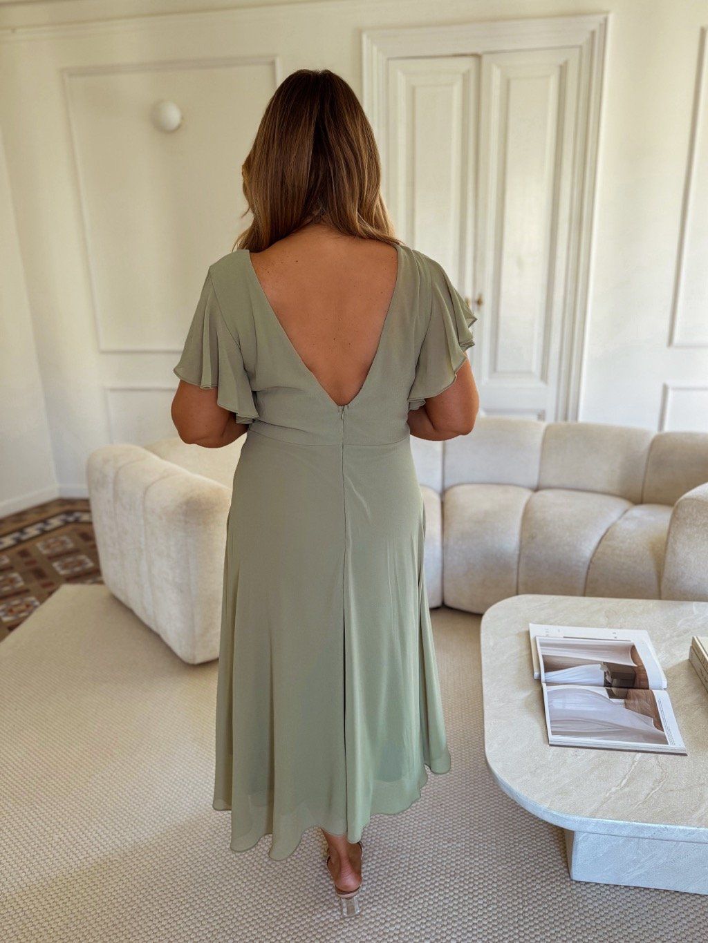 Spoločenské midi šaty v bledozelenej farbe