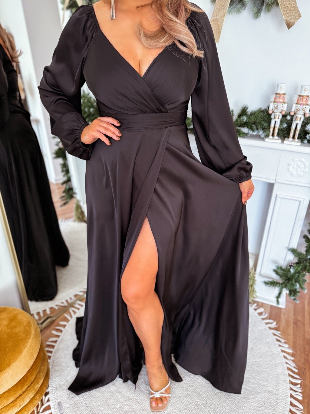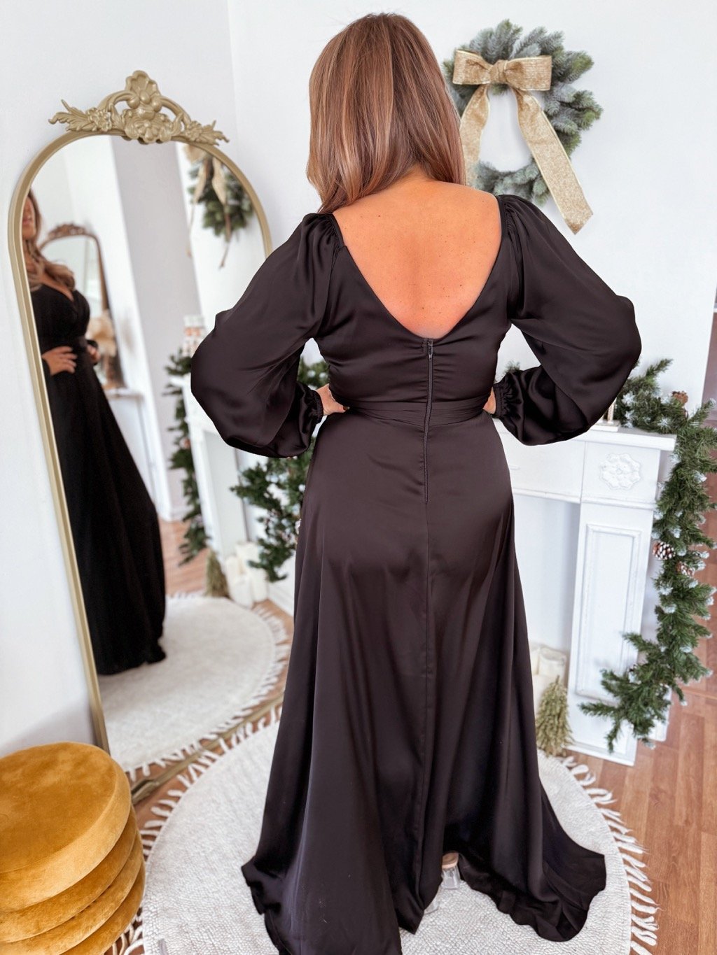 Saténové spoločenské šaty s dlhým rukávom sú zúžene v páse, sukňa je úplne voľná a šaty majú zapínanie na zips na chrbte. Tieto šaty nie sú elastické. Modelka meria 168 cm a má na sebe veľkosť XL (42).