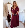 Dlhé bordové saténové šaty s hlbokým výstrihom a krátkym rukávom. Biele spoločenské šaty pre moletky majú zapínanie na zips na chrbte. Sukňa je úplne voľná. Modelka meria 168 cm a má na sebe veľkosť XL (42).