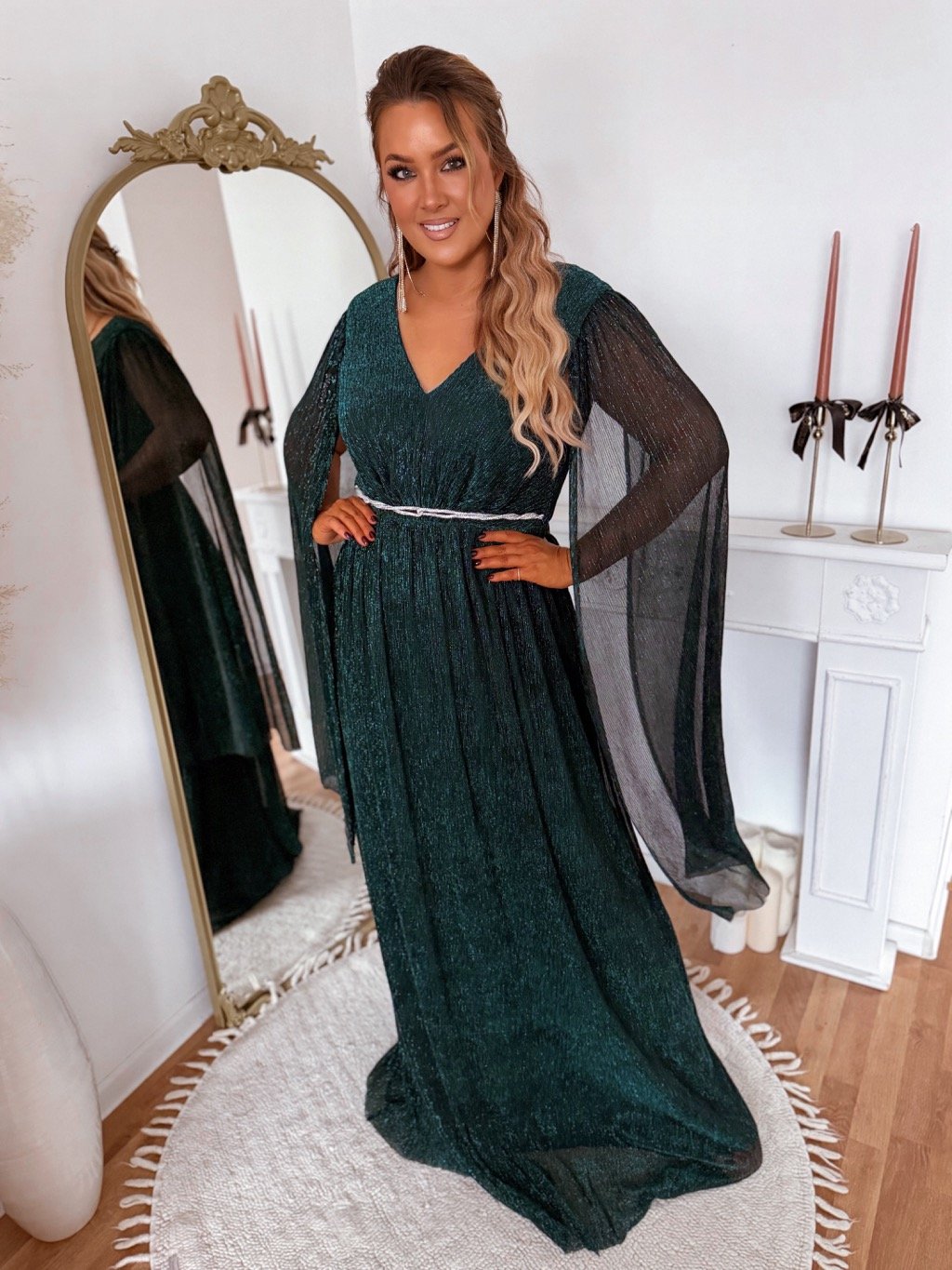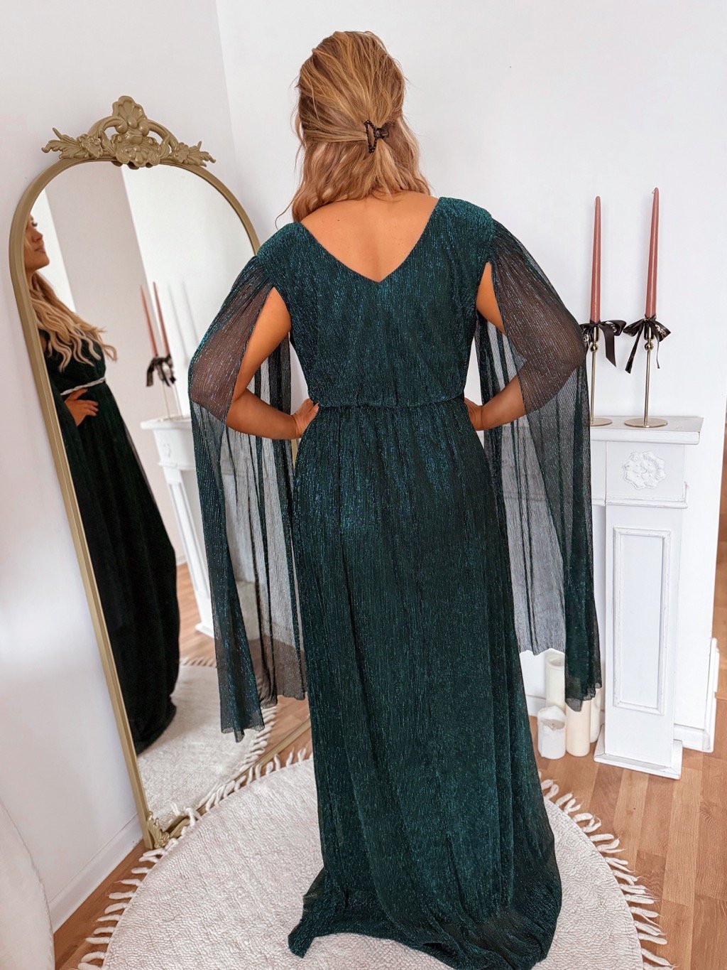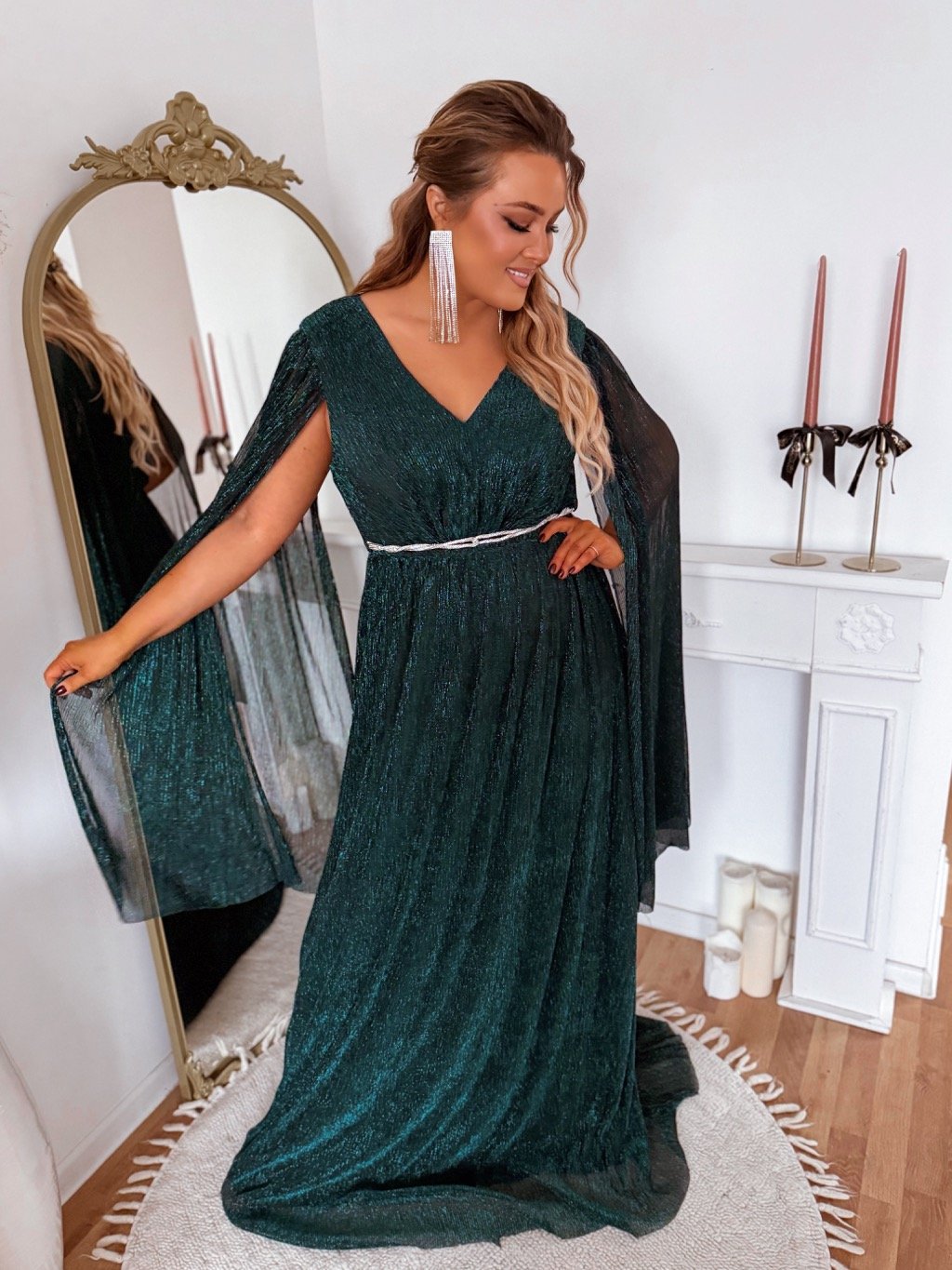 Spoločenské šaty s dramatickým rukávom a našitým ozdobným opaskom v striebornej farbe. Šaty majú voľnejší strih a gumičku v páse. Modelka meria 168 cm a má na sebe veľkosť XL (42).
