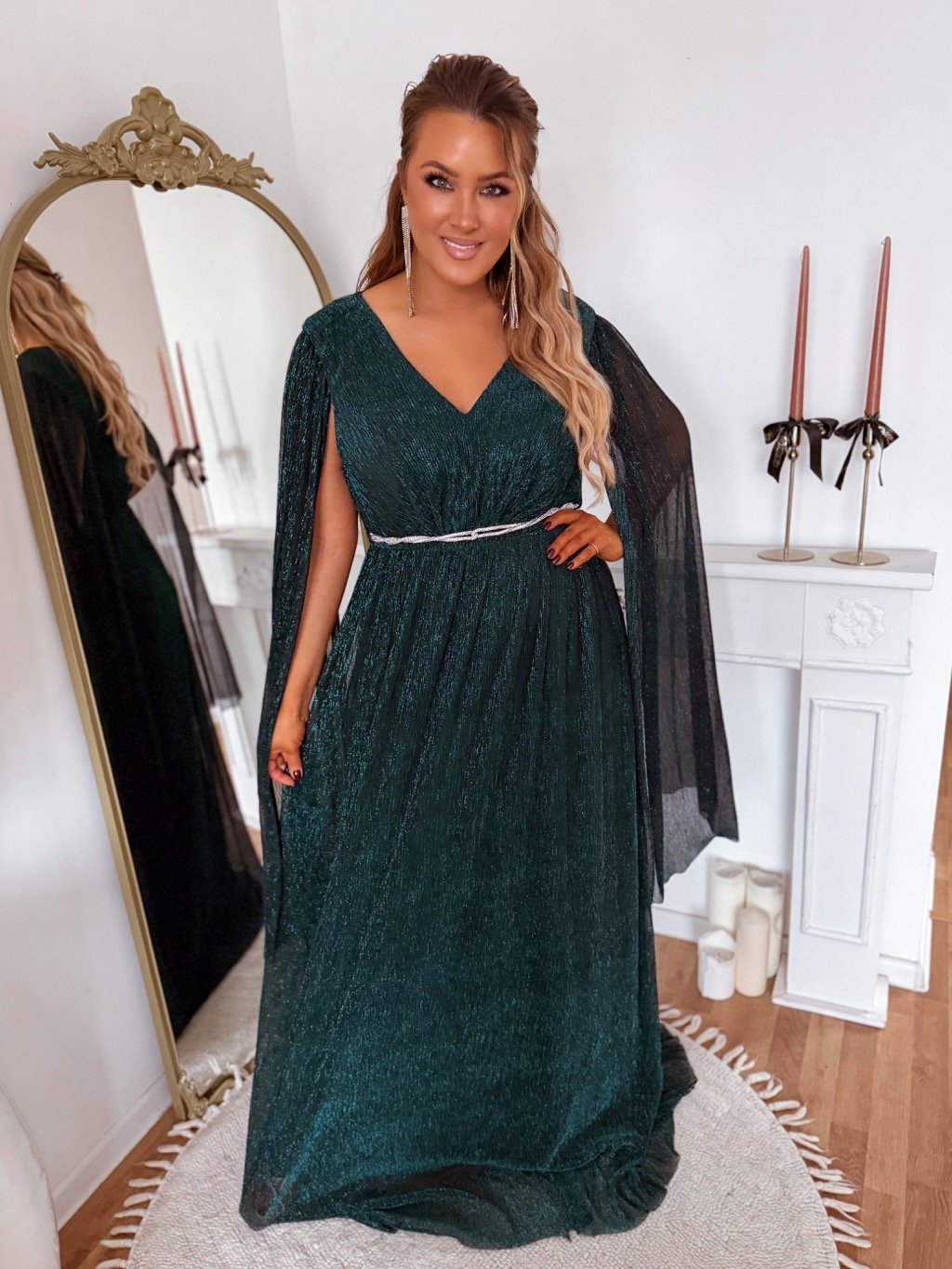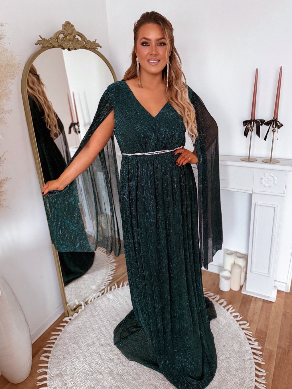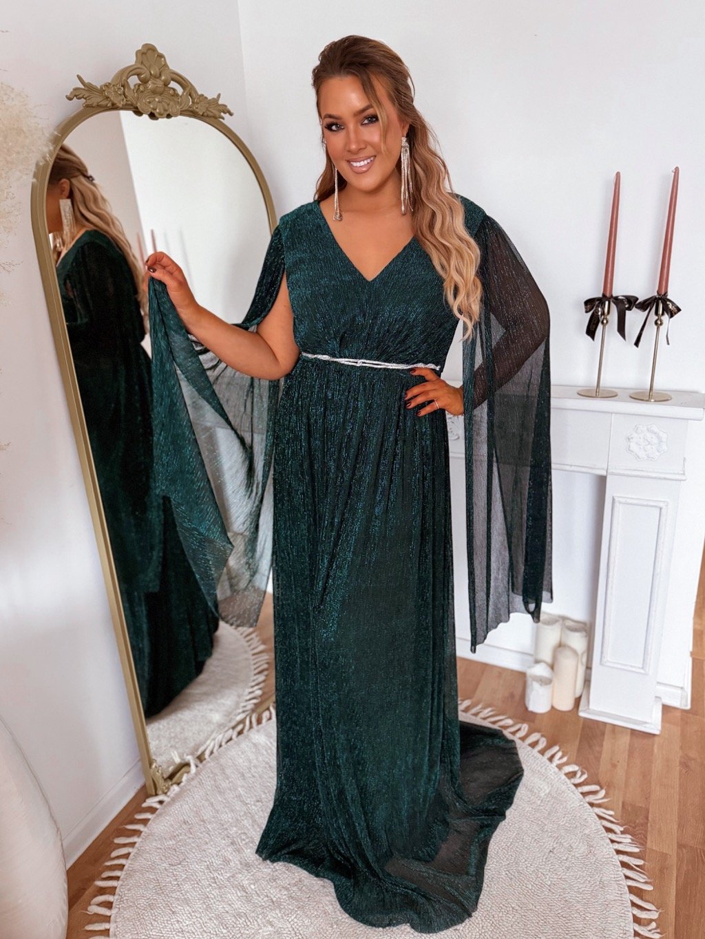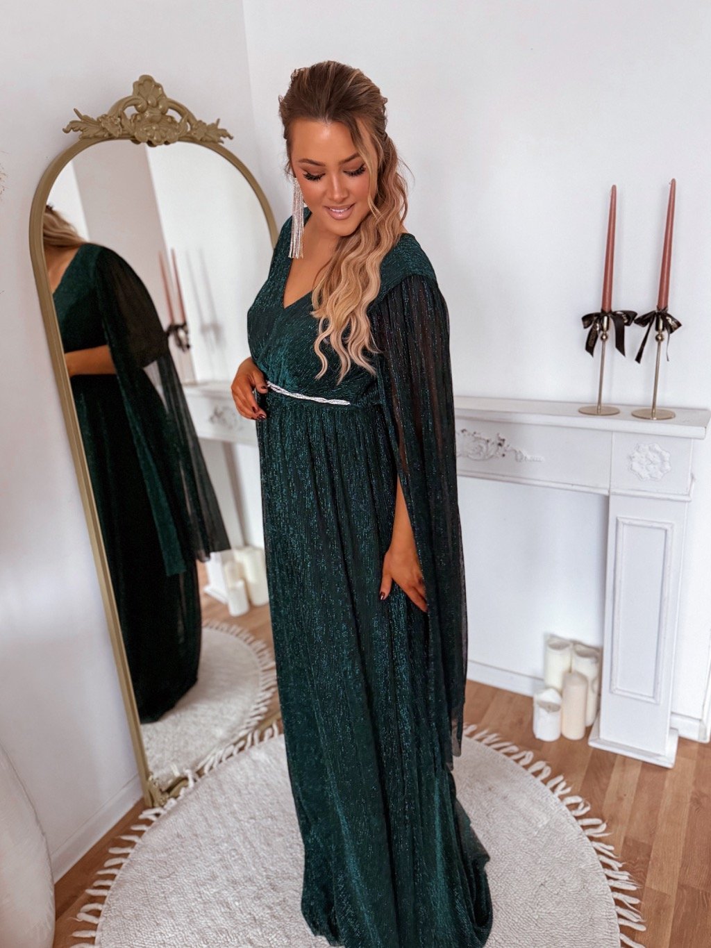 Spoločenské šaty s dramatickým rukávom a našitým ozdobným opaskom v striebornej farbe. Šaty majú voľnejší strih a gumičku v páse. Modelka meria 168 cm a má na sebe veľkosť XL (42).