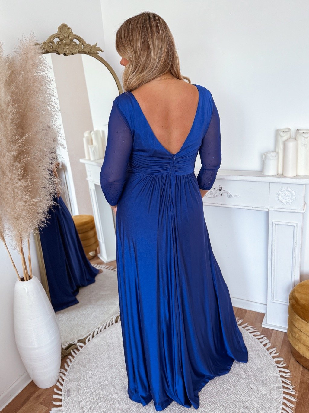 Elegantné spoločenské šaty pre moletky s hlbokým výstrihom sú vyrobené z veľmi elastického materiálu, majú zips na chrbte a jemnú výstuž na prsiach. Rukávy sú priehľadné sú zdobené kamienkami. Modelka meria 168 cm a má na sebe veľkosť XXL.