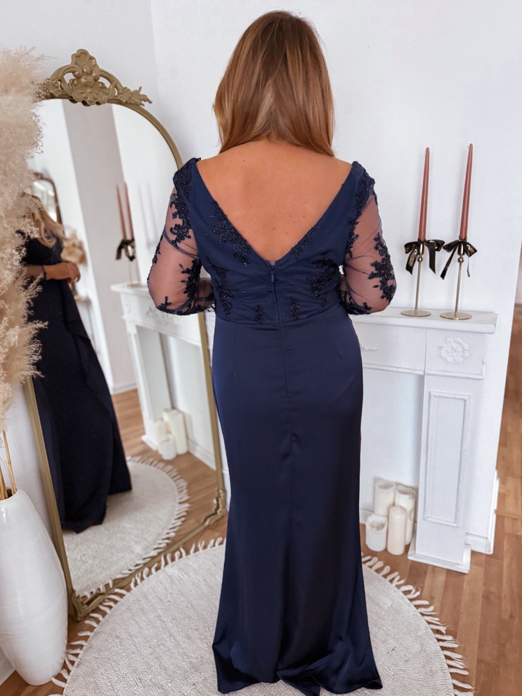 Spoločenské tmavomodré šaty s čipkovaným vrchom