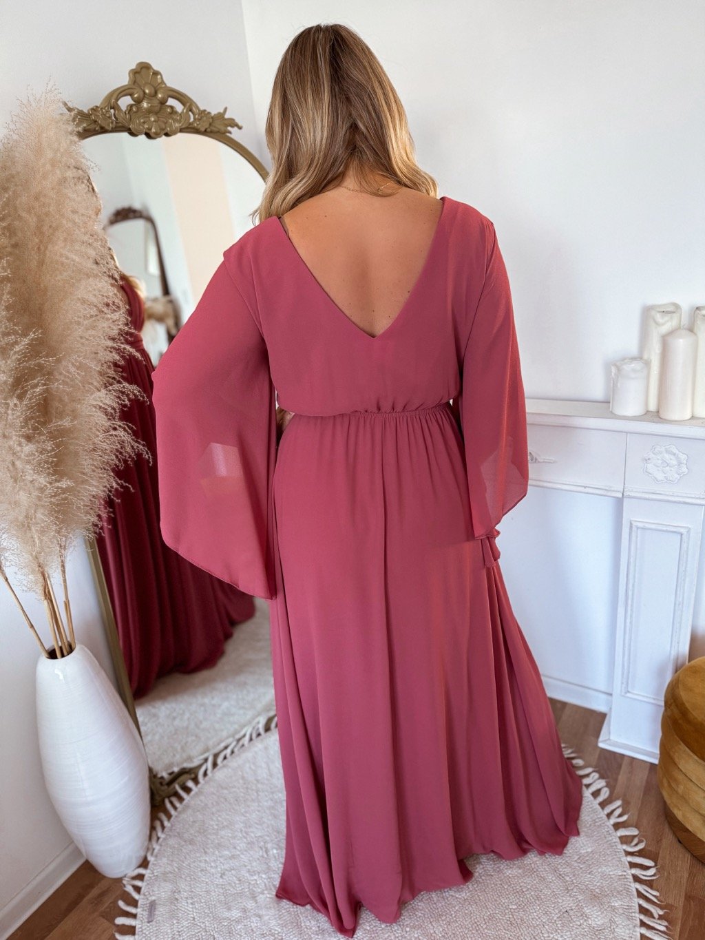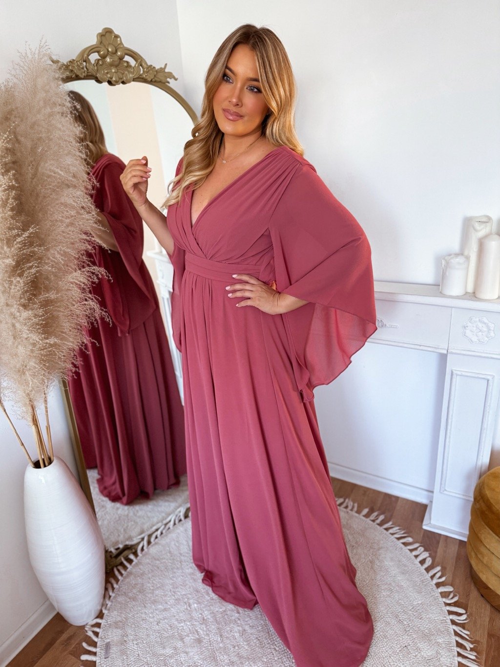 Dlhé spoločenské šaty s hlbokým výstrihom a výrazným dramatickým rukávom. Spoločenské šaty pre moletky majú všitú elastickú gumičku v páse zo zadnej strany. Sukňa je úplne voľná. Modelka meria 168 cm a má na sebe veľkosť XL (42).