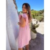 Letné šaty pod kolená so srdiečkami na látke. Šaty s výstrihom do V a krátkym volánovým rukávom, majú elastickú gumičku v páse. Modelka meria 168 cm a má na sebe veľkosť XL.