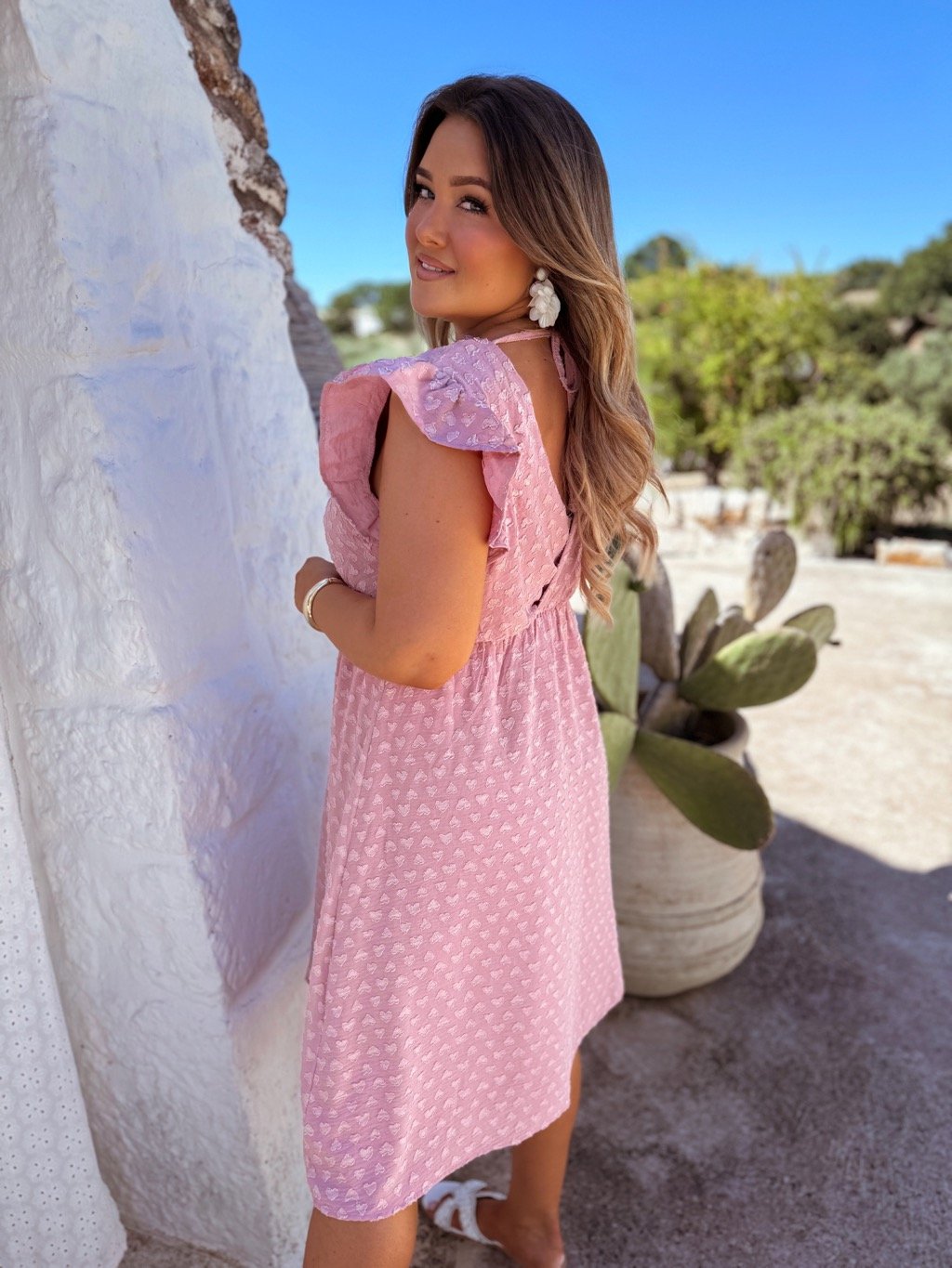 Letné šaty pod kolená so srdiečkami na látke. Šaty s výstrihom do V a krátkym volánovým rukávom, majú elastickú gumičku v páse. Modelka meria 168 cm a má na sebe veľkosť XL.