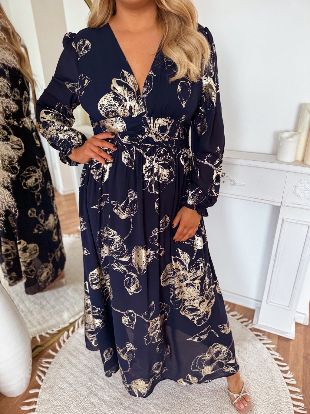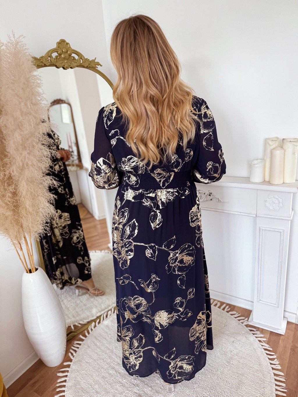 Tieto  tmavomodré maxi šaty so zlatým kvetinovým vzorom sú ideálnou voľbou na spoločenské udalosti, oslavy aj romantické večere. Hlboký výstrih do V a zvýraznený pás s gumičkou krásne tvarujú postavu, zatiaľ čo dlhé rukávy dodávajú šatám jemnú eleganciu. Ľahký padavý materiál sa príjemne nosí a vytvára ženský, pôvabný vzhľad. Modelka meria 168 cm a má na sebe veľkosť XL.