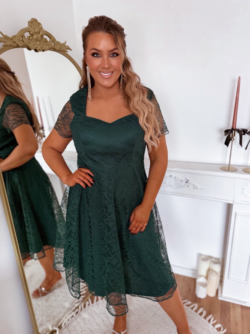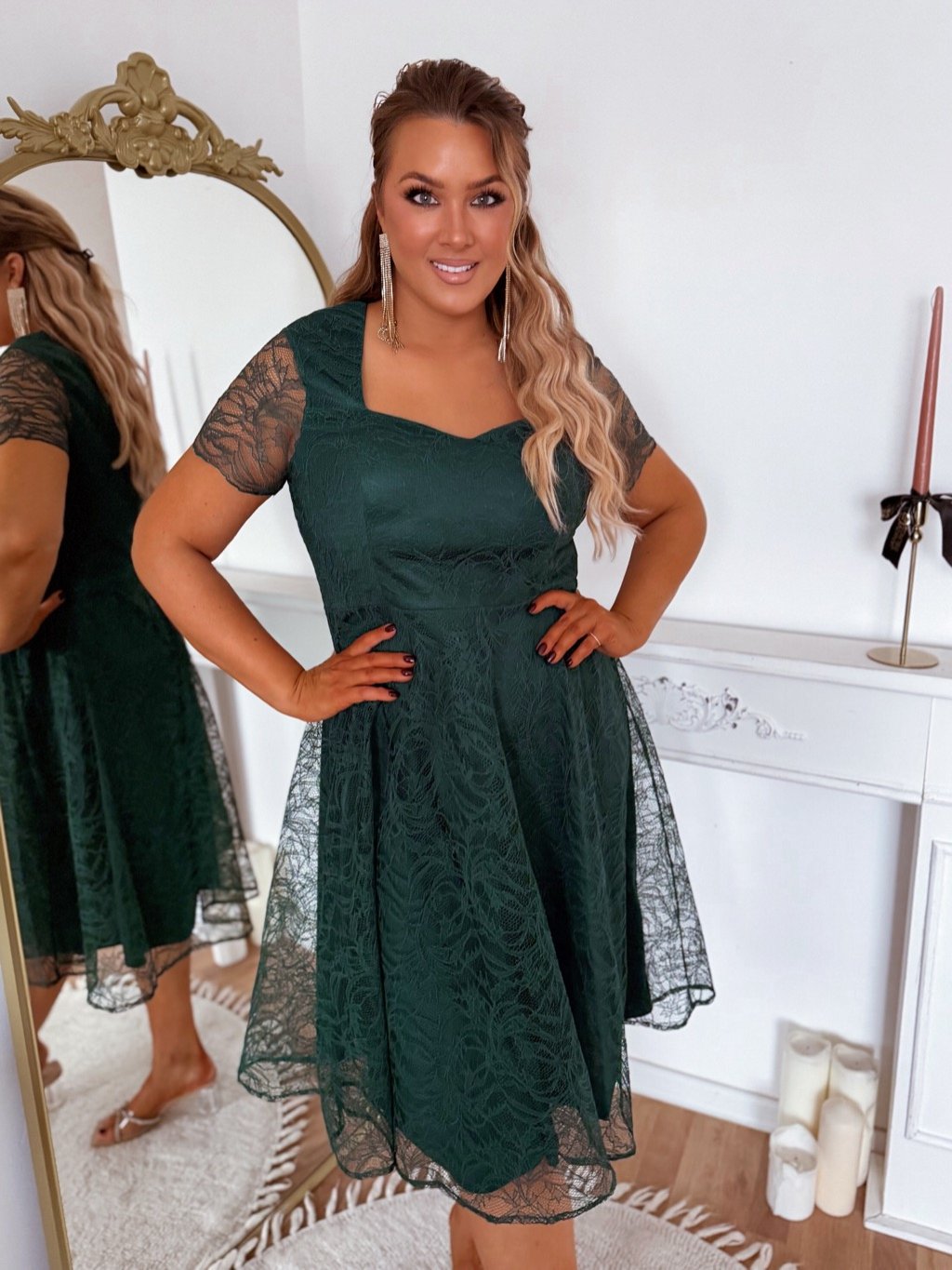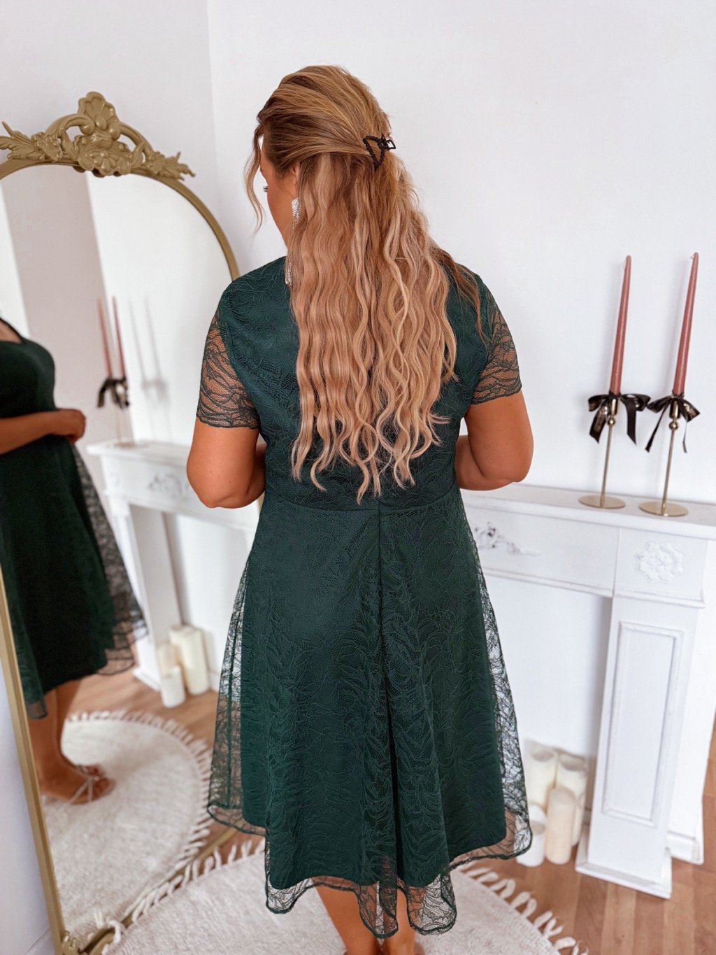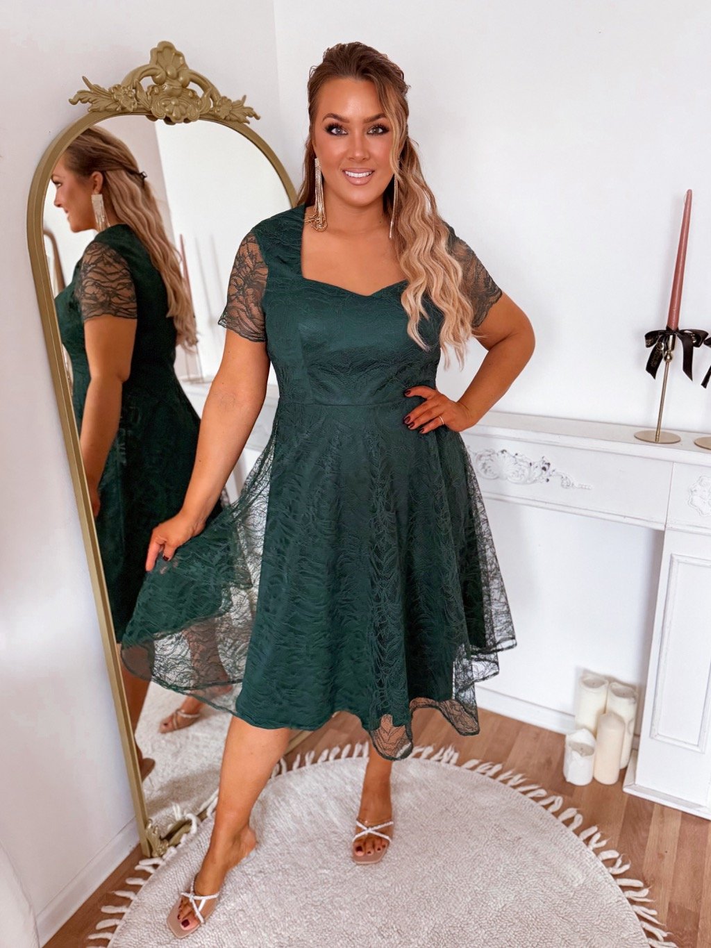Čipkované šaty s krátkym rukávom majú áčkový strih a zapínanie na zips na chrbte. Šaty majú jemné penové vypchávky na prsiach. Modelka meria 168 cm a má na sebe veľkosť XL.