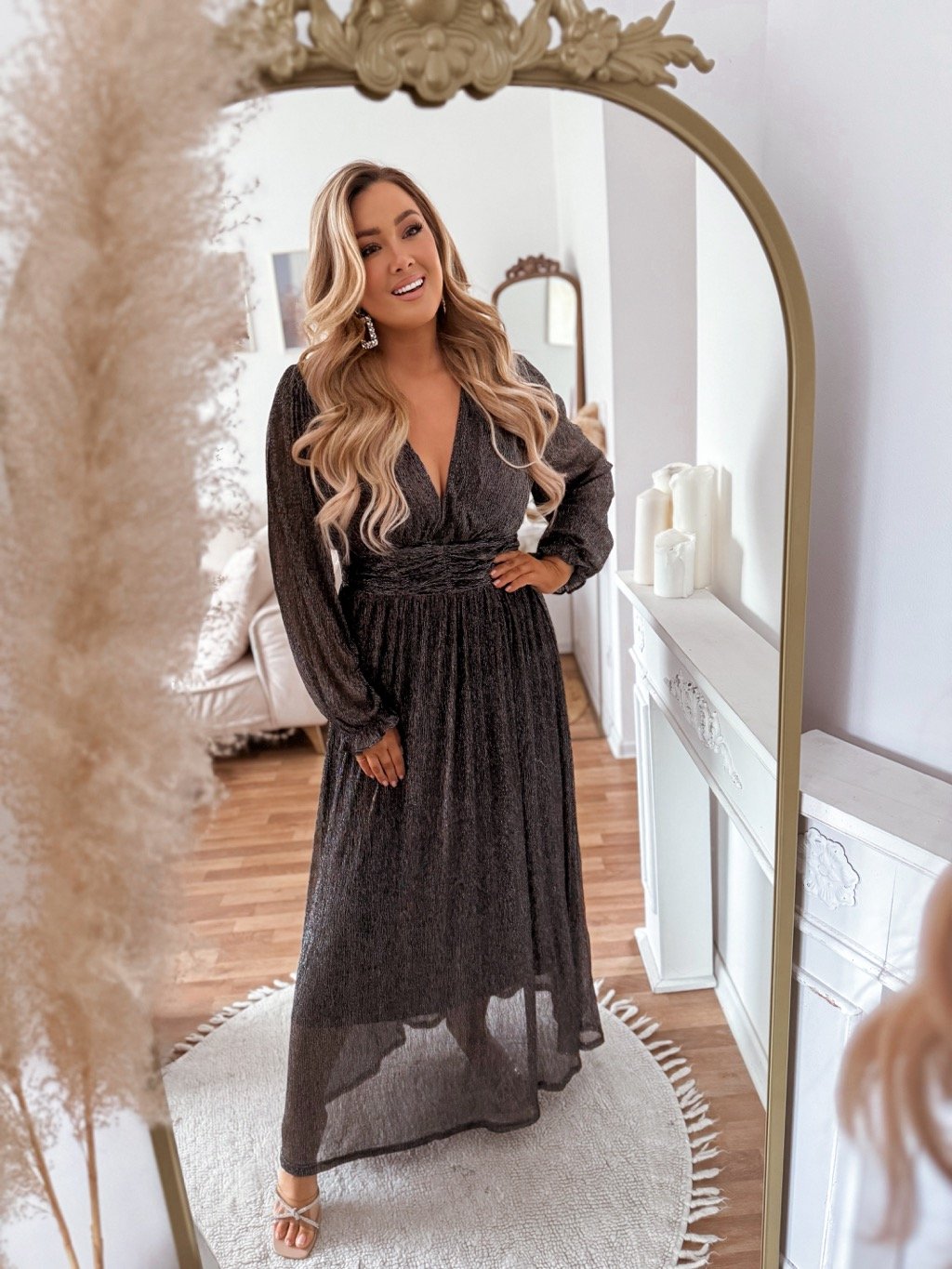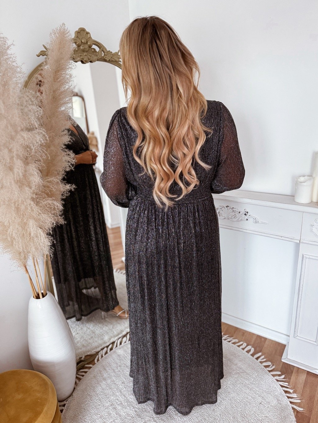 Elegantné maxi šaty v čiernej so strieborným leskom pôsobia luxusne a žensky. Výstrih do tvaru V krásne zvýrazní dekolt, zatiaľ čo zvýraznený elastický pás opticky tvaruje postavu. Ideálne na spoločenské udalosti, svadby, oslavy či večerné príležitosti, kde zaručene zaujmete svojím štýlom. Modelka meria 168 cm a má na sebe veľkosť XL.