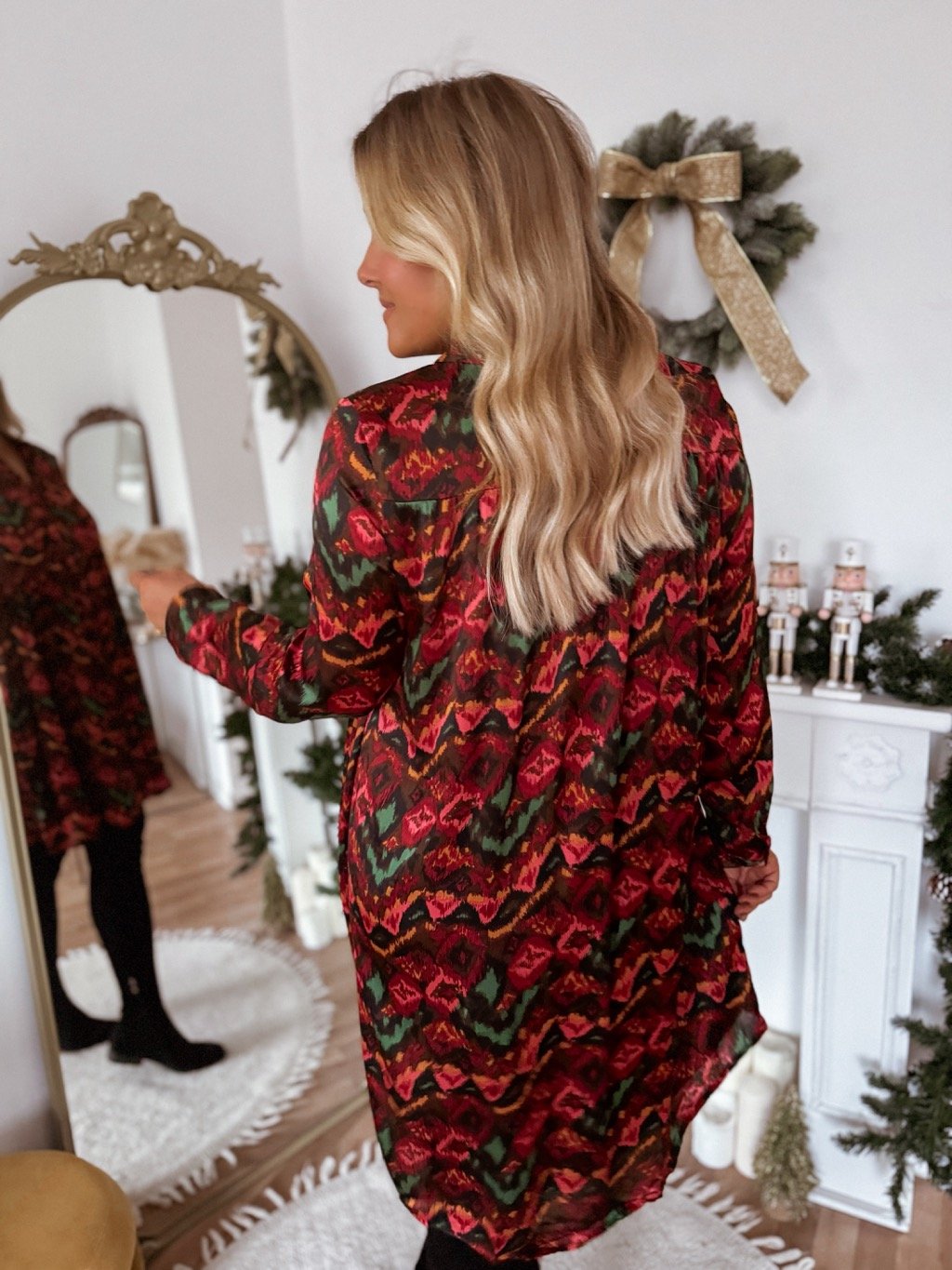 Košeľové šaty so vzorom majú úplne voľný strih. Modelka meria 168 cm a má na sebe veľkosť L/XL.
