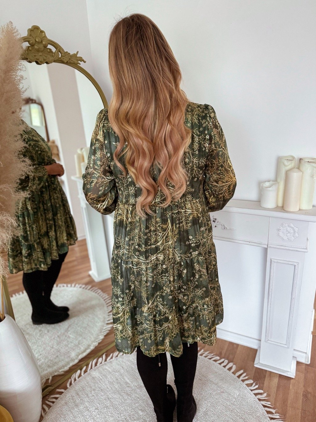 Krátke zelené áčkové šaty so vzorom kvetov. Modelka meria 168 cm a má na sebe veľkosť L/XL.
