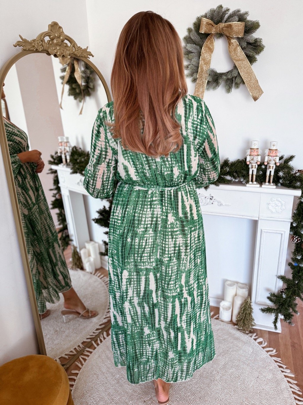 Elegantné vzorované šaty s dlhým rukávom a výstrihom do V. Pod prsiami je elastická gumička. Modelka meria 168 cm a má na sebe veľkosť L/XL.