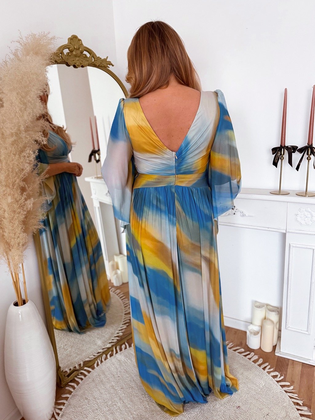 Spoločenské elastické šaty so zipsom na chrbte a rozparkom. Spoločenské šaty majú jemnú výstuž na prsiach a vypchávky na ramenách. Modelka meria 168 cm a má na sebe veľkosť 2XL/3XL.
