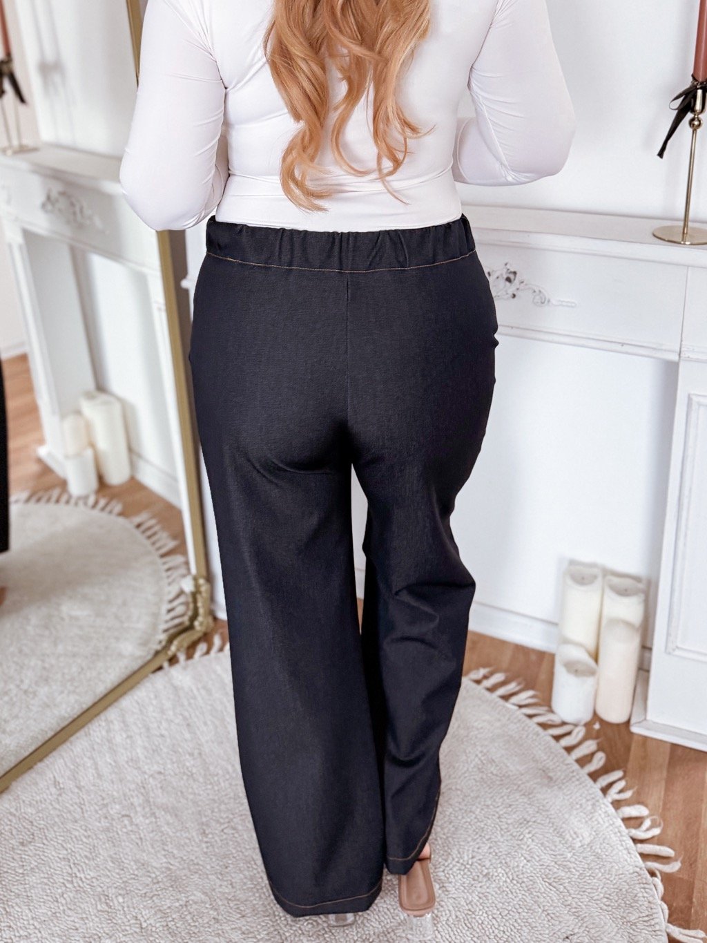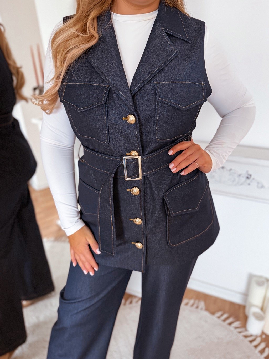 Elastická denimová súprava sa skladá z voľnej vesty ktorá sa sťahuje opaskom v páse a nohavíc s vreckami ktoré majú gumičku v páse. Modelka meria 168 cm a má na sebe veľkosť XL.