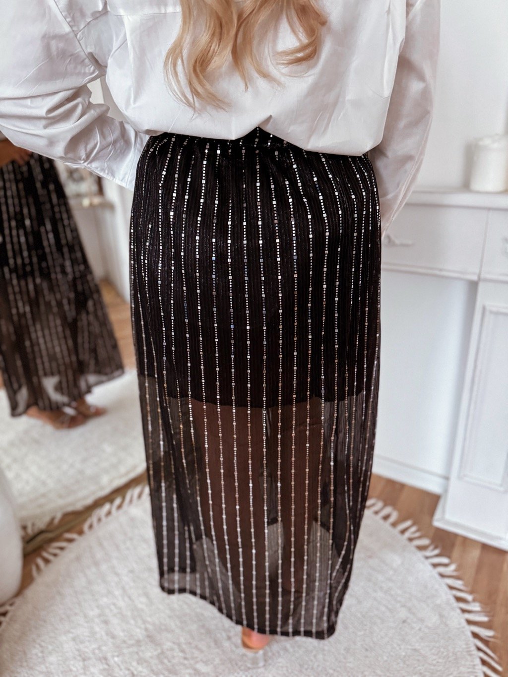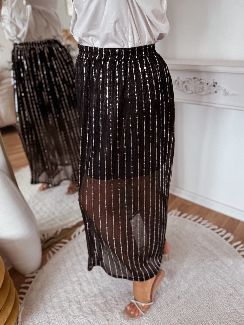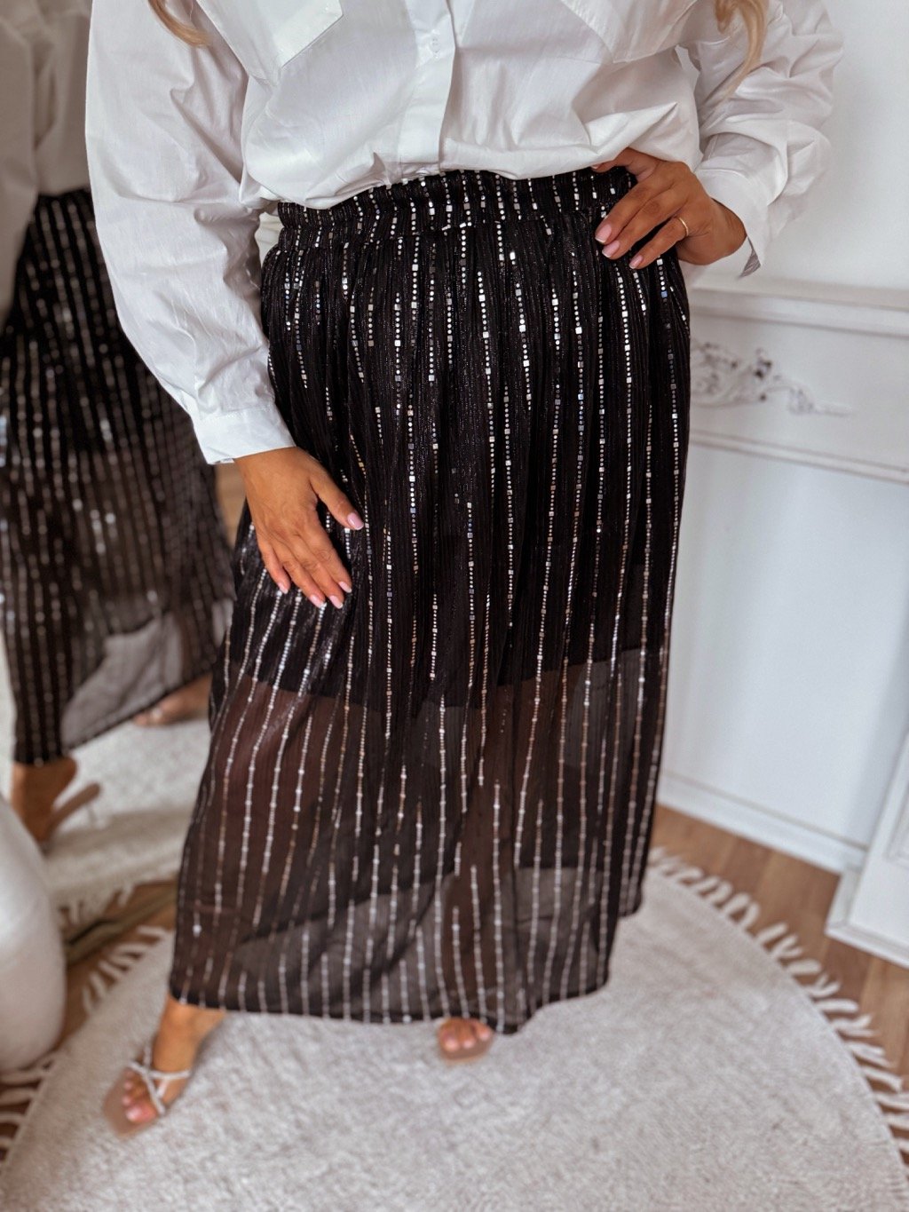 Elegantná čierna sukňa s elstickým pásom. Modelka meria 168 cm a má na sebe veľkosť L/XL.