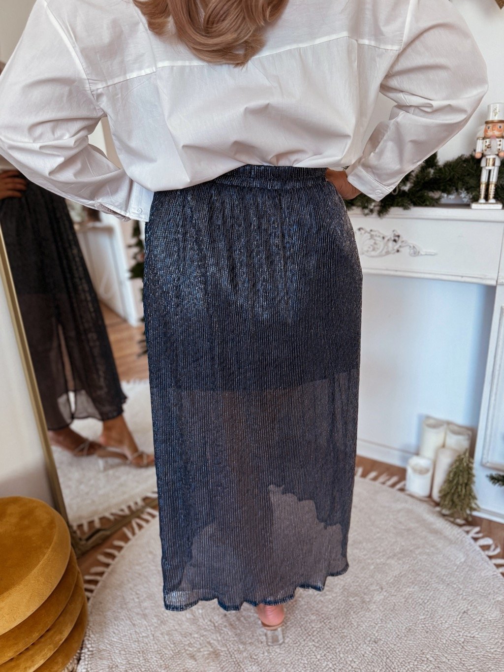Elegantná modrá sukňa s elstickým pásom. Modelka meria 168 cm a má na sebe veľkosť L/XL.