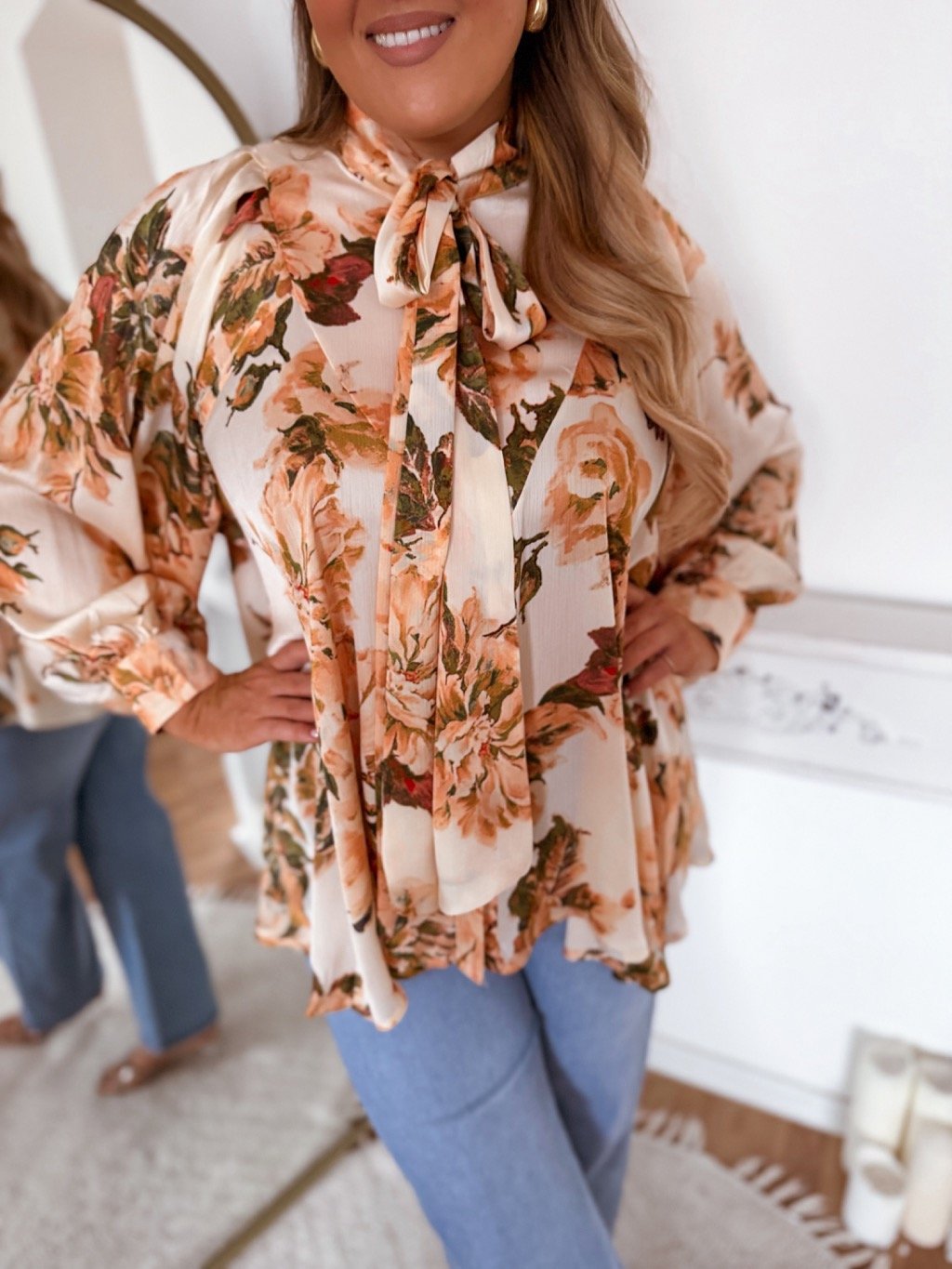 Úplne voľná blúzka so viazaním ku krku. Košeľa sedí na veľkosti L-2XL. Modelka meria 168 cm a má na sebe univerzálnu veľkosť.