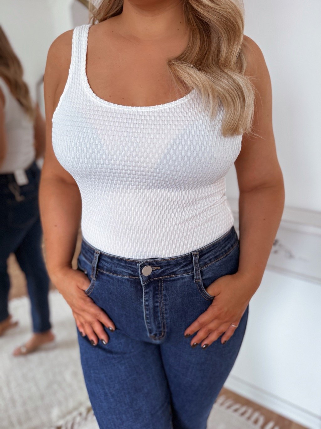Elastické biele body sa prispôsobí postave. Modelka meria 168 cm a má na sebe veľkosť XL.