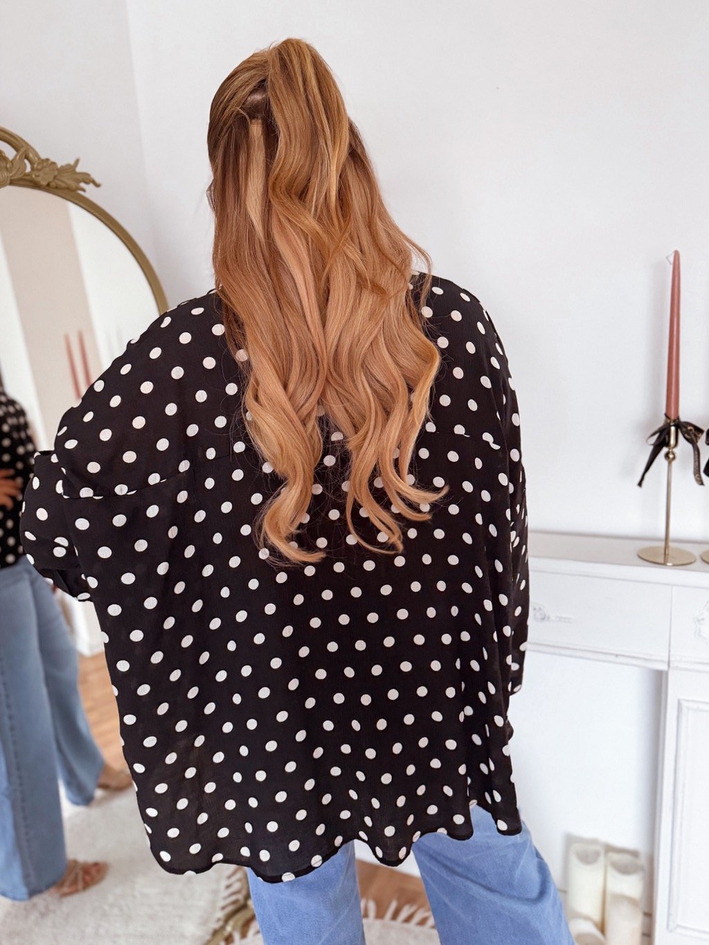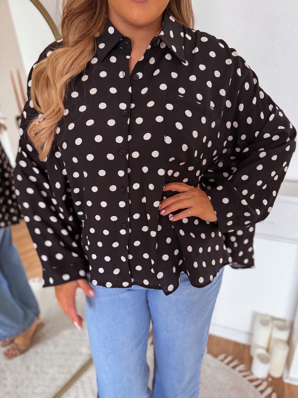 Krátka voľná bodkovaná košeľa s rozšíreným rukávom. Košeľa sedí na veľkosti L-2XL. Modelka meria 168 cm a má na sebe univerzálnu veľkosť.