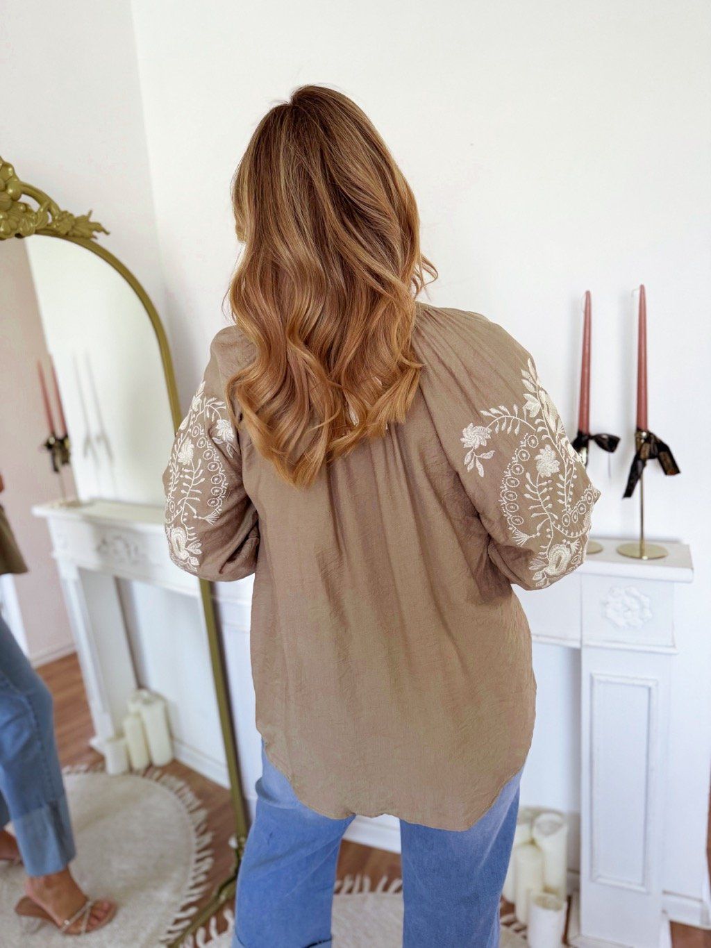 Voľná dámska košeľa s výšivkou. Modelka meria 168 cm a má na sebe veľkosť XL.