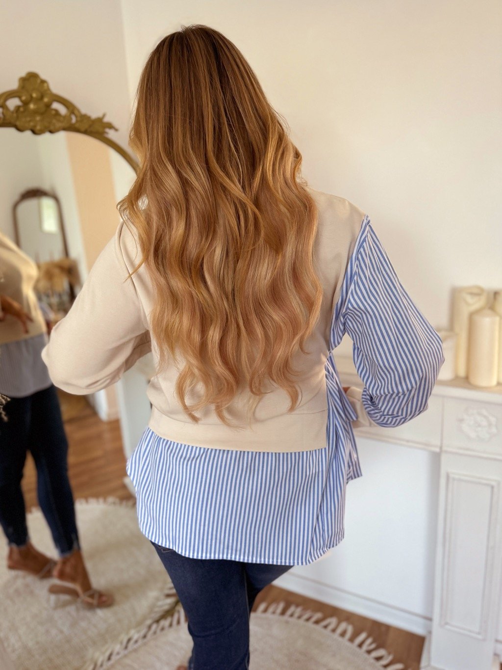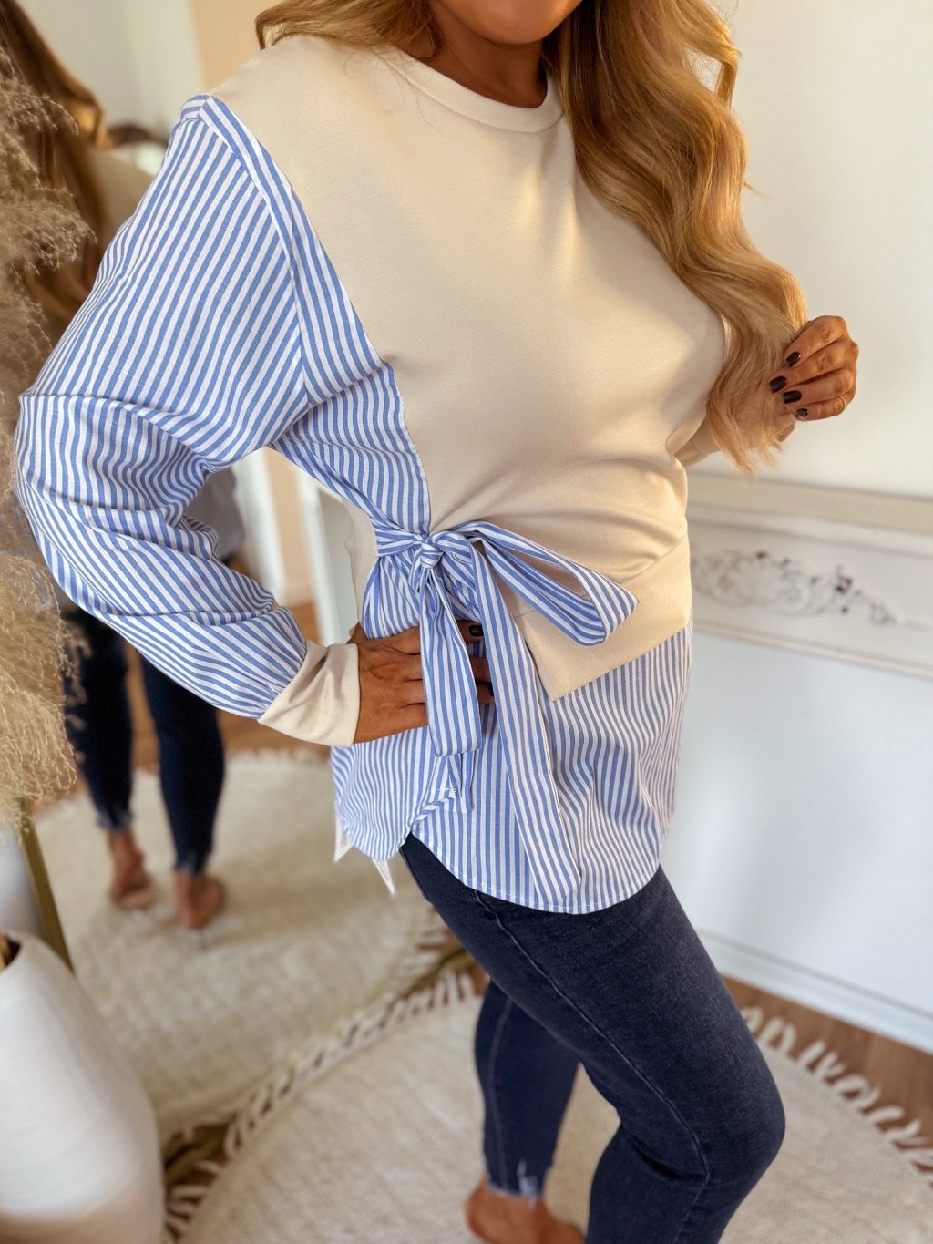Štýlová krémová mikina s prúžkovaným detailom a mašľou na boku spája ležérny komfort s elegantným nádychom. Predná časť je z jemného hladkého materiálu, zatiaľ čo spodná časť a rukáv zdobia modro-biele prúžky pre originálny kontrast. Mikina sa sťahuje mašľou. Modelka meria 168 cm a má na sebe veľkosť L/XL.