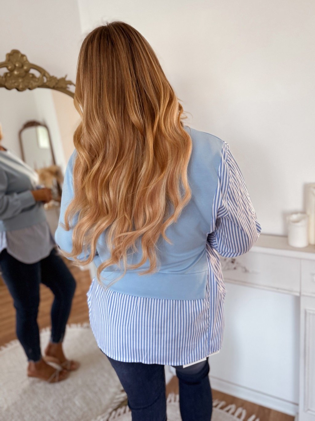 Štýlová krémová mikina s prúžkovaným detailom a mašľou na boku spája ležérny komfort s elegantným nádychom. Predná časť je z jemného hladkého materiálu, zatiaľ čo spodná časť a rukáv zdobia modro-biele prúžky pre originálny kontrast. Mikina sa sťahuje mašľou. Modelka meria 168 cm a má na sebe veľkosť L/XL.