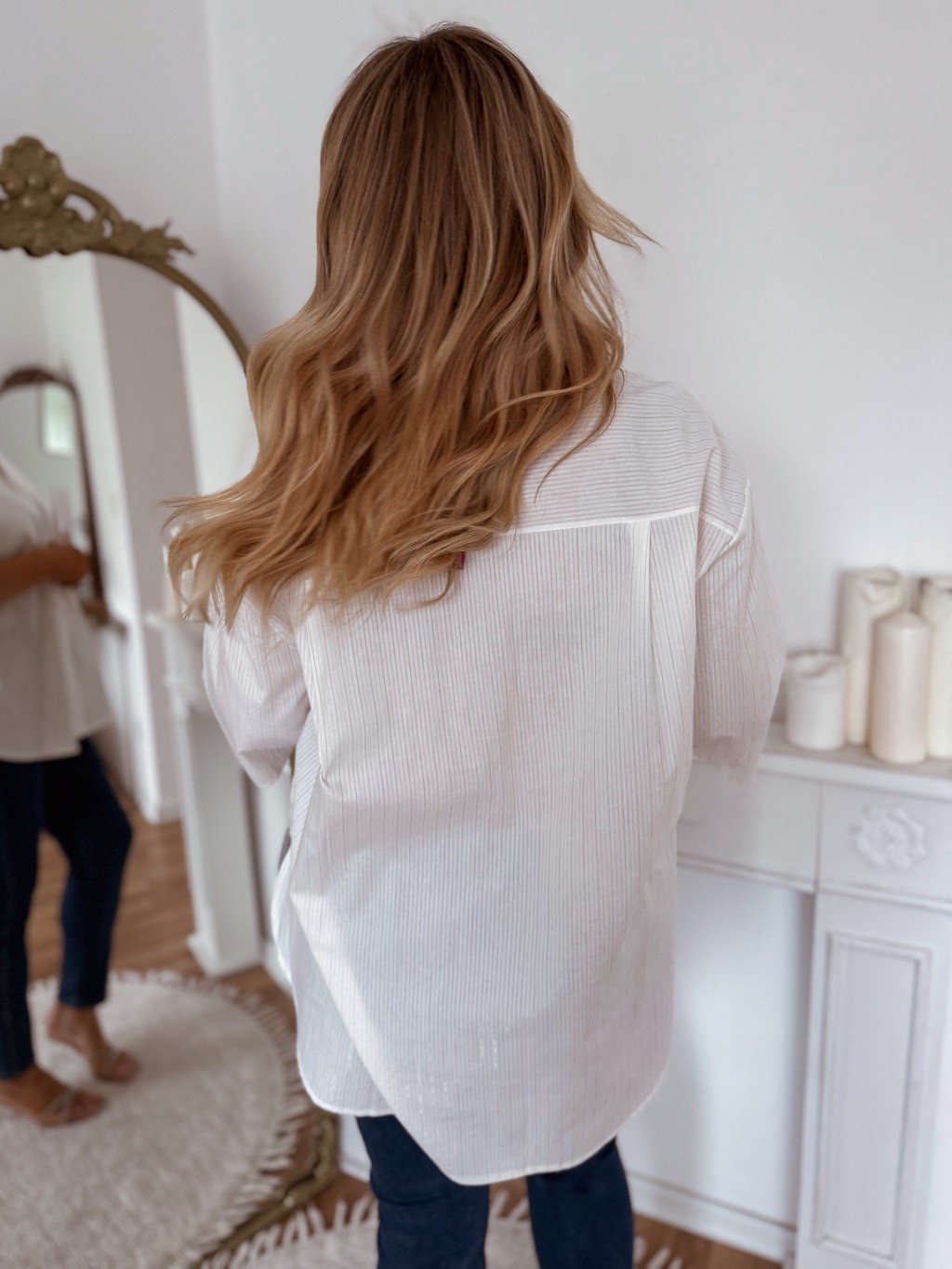 Úplne voľná oversize dámska bavlnená košeľa. Modelka meria 168 cm a má na sebe veľkosť L/XL.