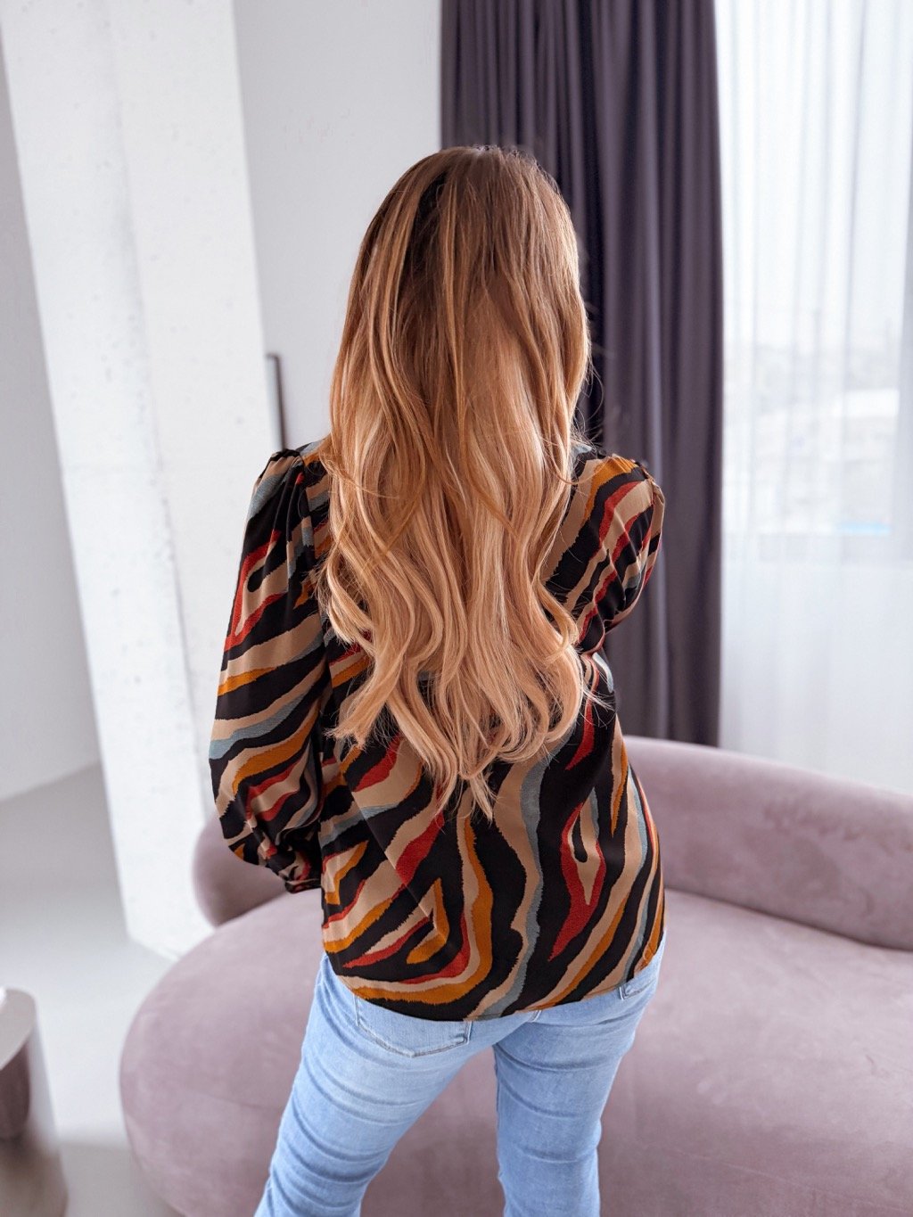 Vzorovaná dámska blúzka  so zapínaním na gombíky, výstrihom do V a dlhým rukávom. Blúzka je mierne elastická, má voľnejší strih. Modelka meria 168 cm a má na sebe veľkosť XL.