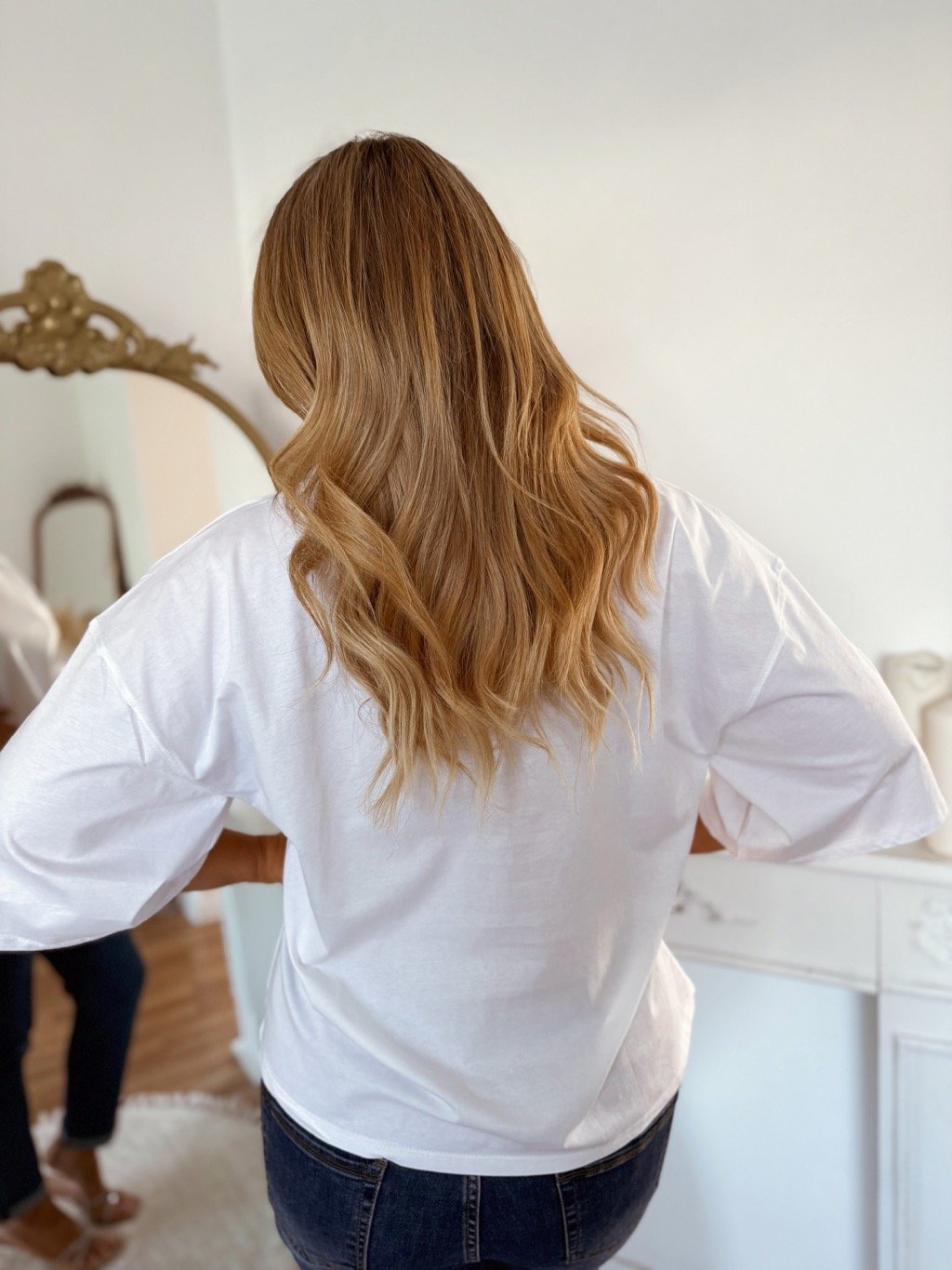 Voľné dámske tirčko so širokými rukávmi je mierne elastické. Ideálny kúsok na každý deň – môžete ho kombinovať s džínsami, sukňou aj elegantnými nohavicami. Modelka meria 168 cm a má na sebe veľkosť XL.